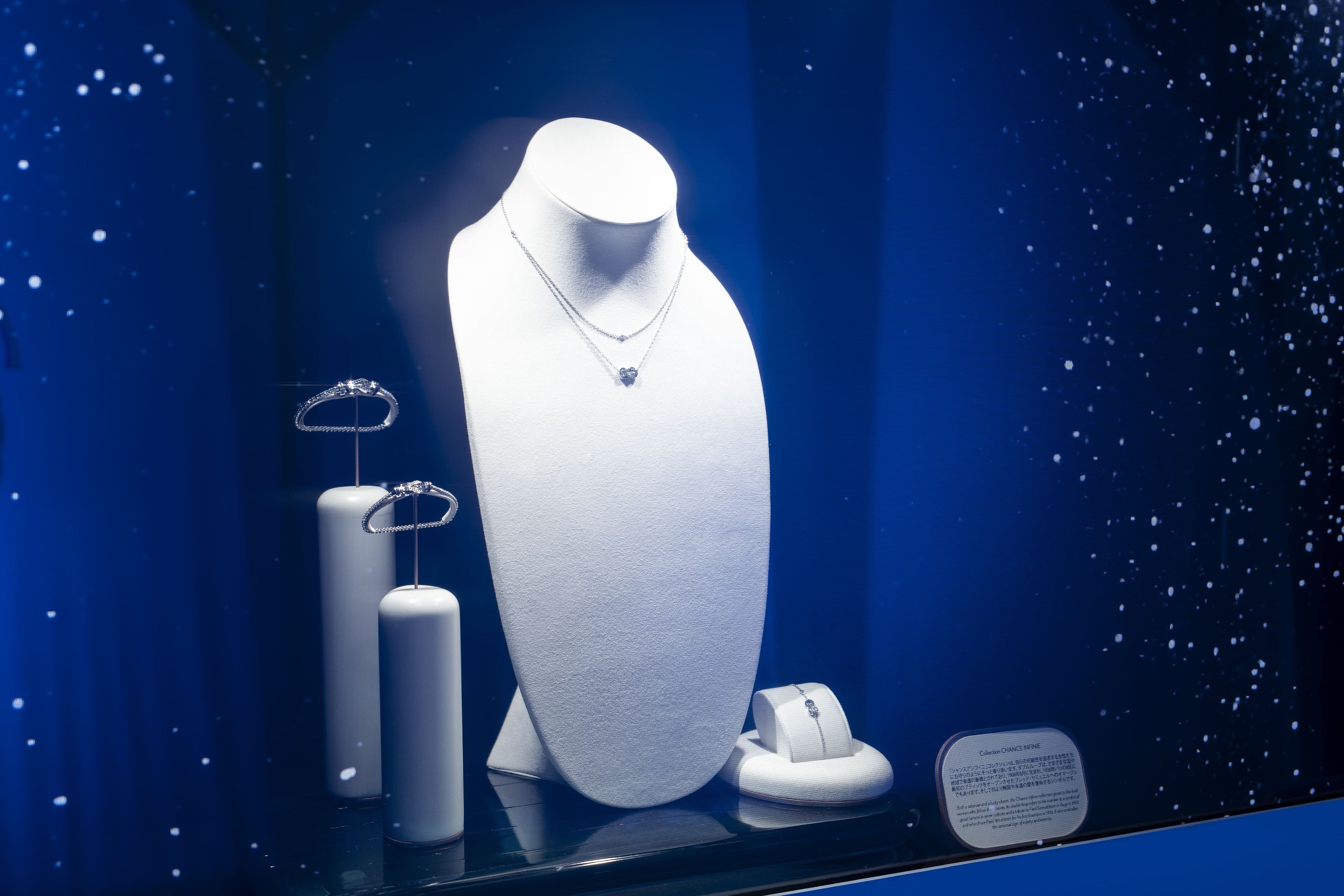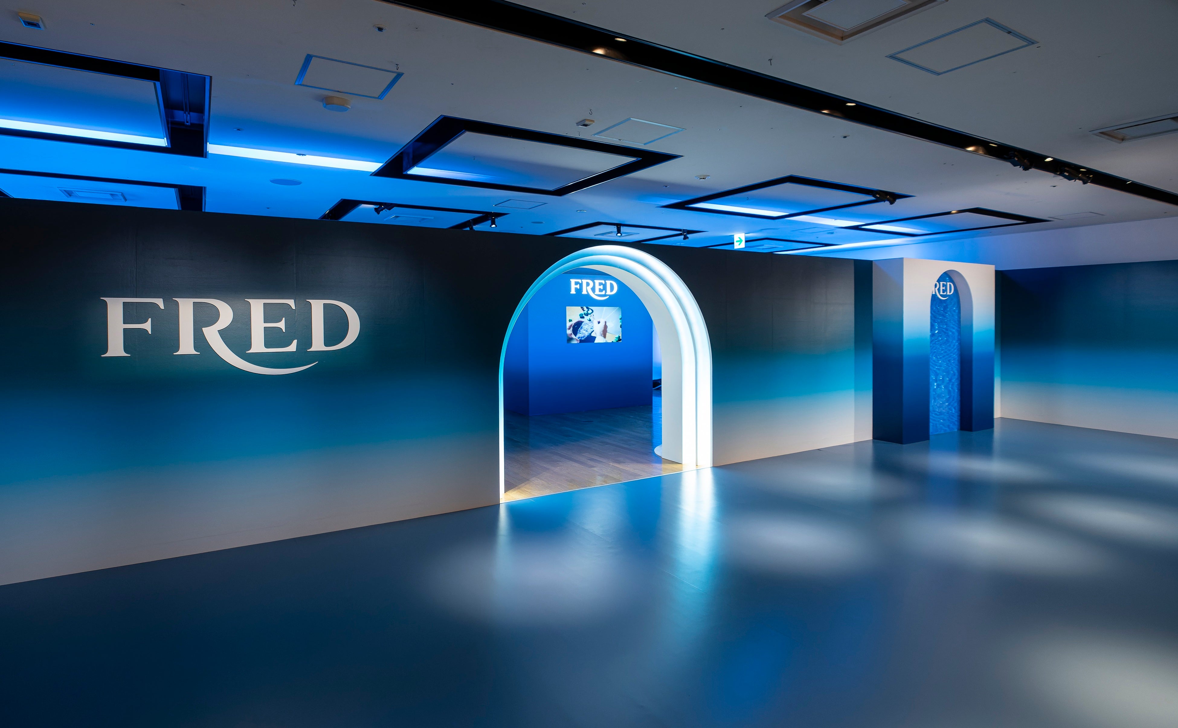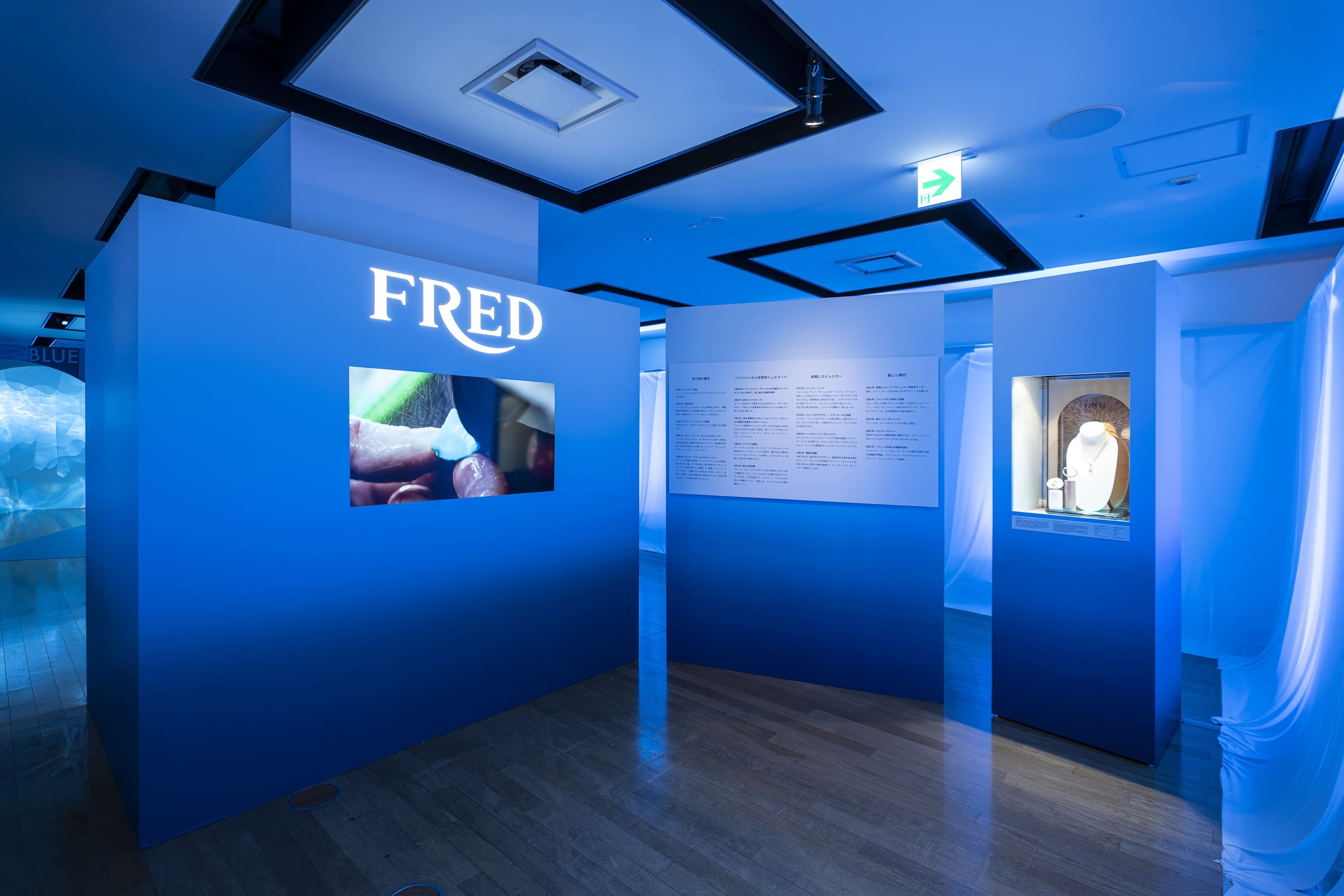 そこには、ブランドのビジョンに沿った貴重なドローイングが展示され、フレッドの歴史を創り上げた貴石で作られたパリュールや、1966年に誕生したフォース10のヘリテージ ジュエリーなど、来場者をフレッドの世界へと誘うように、ブルーの光が優しく照らします。