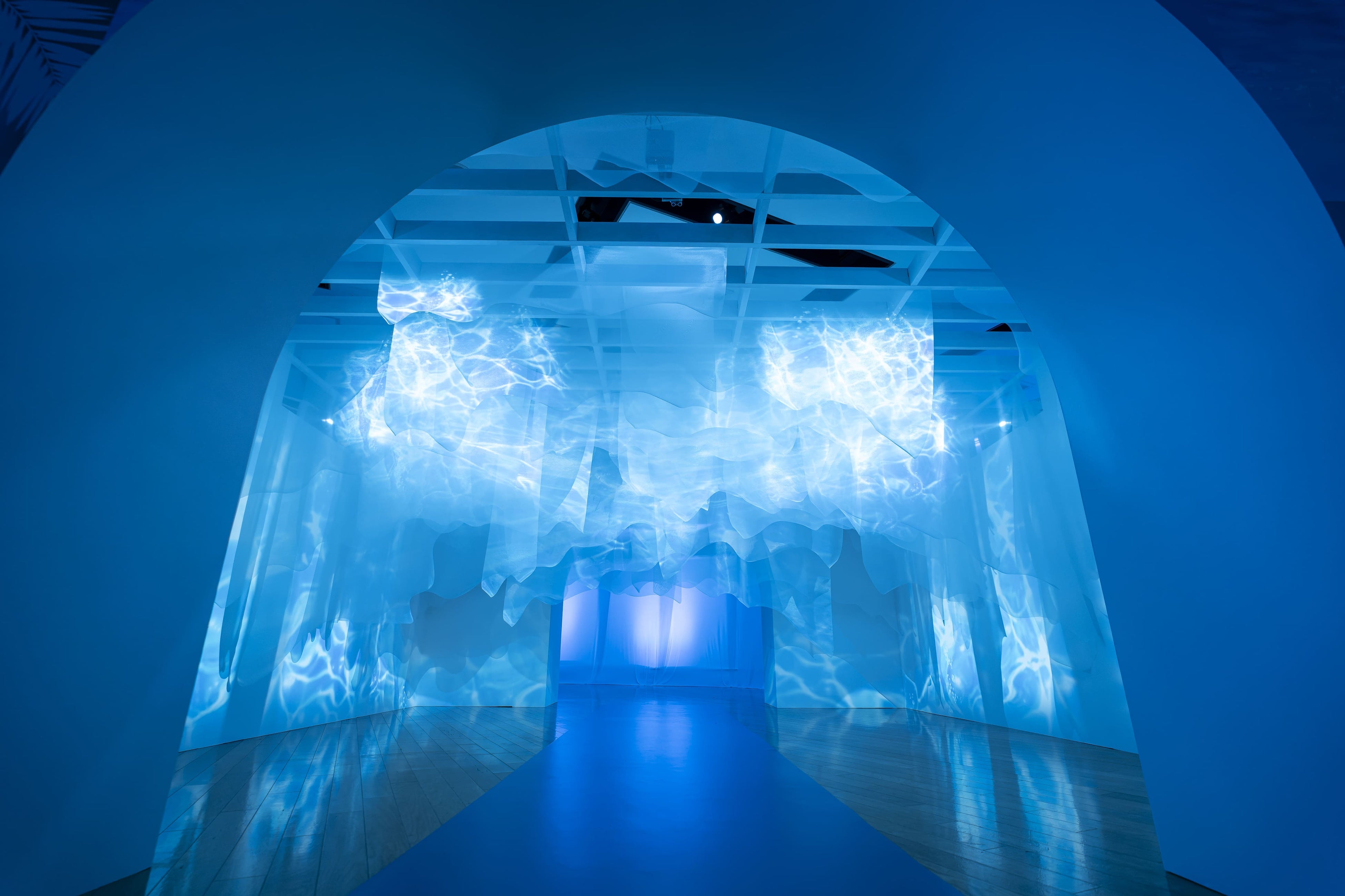 そのブルーのレンズを通して見ていただくために、フレッドが用意したのは、来場者が足を踏み入れると、喜びと感動に満ちた広々としたエリアで爽やかな感覚、幸福と一体感の波のような抗いがたい振動が広がる空間です。