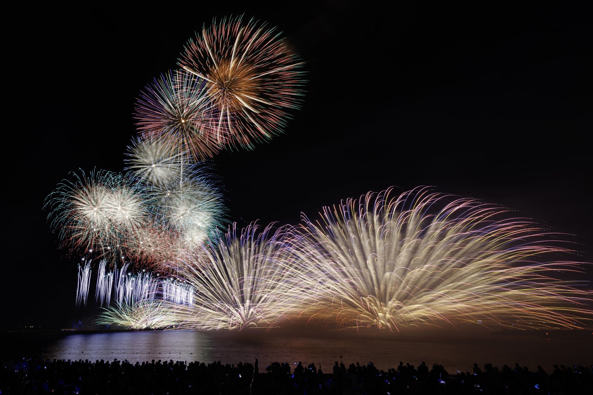 福井県坂井市の夏の風物詩「三国花火」は、打ち上げ地点と客席が極めて近く、花火が降り注いでくるような臨場感があります。最大二尺玉の打ち上げ花火をはじめ、音楽花火やスターマインなどの花火が真夏の夜空を美しく彩ります。中でも花火師が船から直接海に投げ込む水中花火が一番の名物となっています。