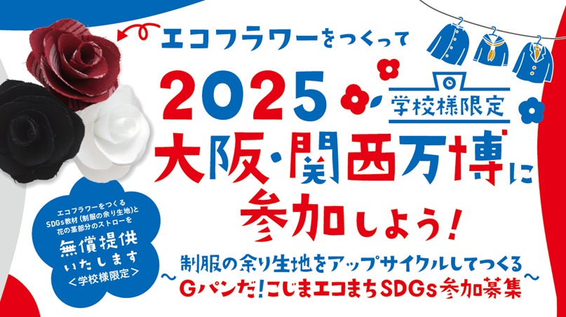菅公学生服株式会社 (本社:岡山市北区駅元町 代表取締役社長:尾崎 茂 以下:カンコー学生服)は、2024年9月10日より、「繊維のまち」岡山県倉敷市児島のイメージキャラクター「Gパンだ」をモチーフに、児島地区の企業団体・学校・子ども・地域住民が共創する児島アートプロジェクト<第一弾>として、制服の余り生地をアップサイクルしてつくるエコフラワー×『Gパンだ!こじまエコまちSDGs』をスタートします。そこで、参加してくださる小学校・中学校・高校を全国で募集いたします。