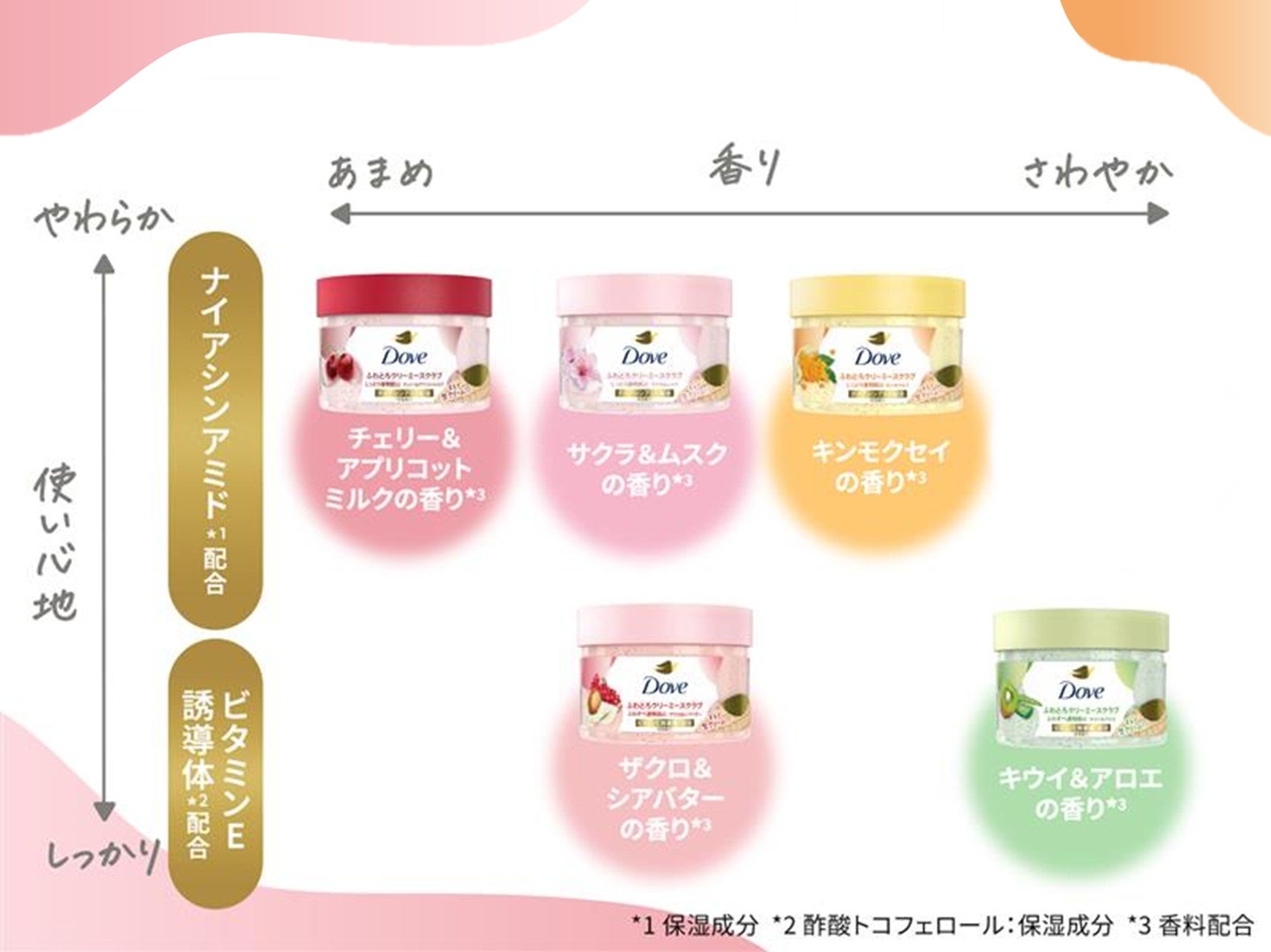 細かい粒子で肌への負担を抑えながら古い角質をやさしく落とすスクラブ成分※2や、うるおい成分が肌の深層※3まで浸透するしっとりクリーム※4配合に加えて、2種類の保湿成分をバリアント毎に配合。やわらかいテクスチャーの「サクラ&ムスク」「チェリー&アプリコットミルク」「キンモクセイ」にはナイアシンアミド※5を配合。しっとりした透明肌に導きます。また、なめらかなテクスチャーの「ザクロ&シアバター」「キウイ&アロエ」には、ビタミンE誘導体※6を配合。ふわすべ透明肌を目指したい方におすすめです。なりたい肌に合わせてリニューアルした「ダヴ ふわとろ クリーミースクラブ」シリーズを選んで、心も身体も癒される贅沢なお風呂時間を過ごしてみませんか。