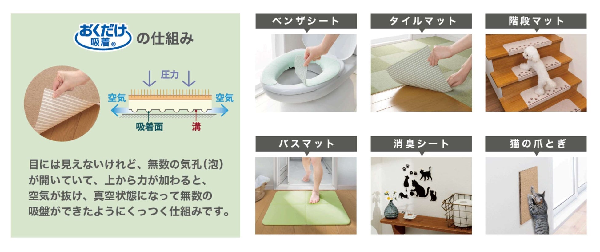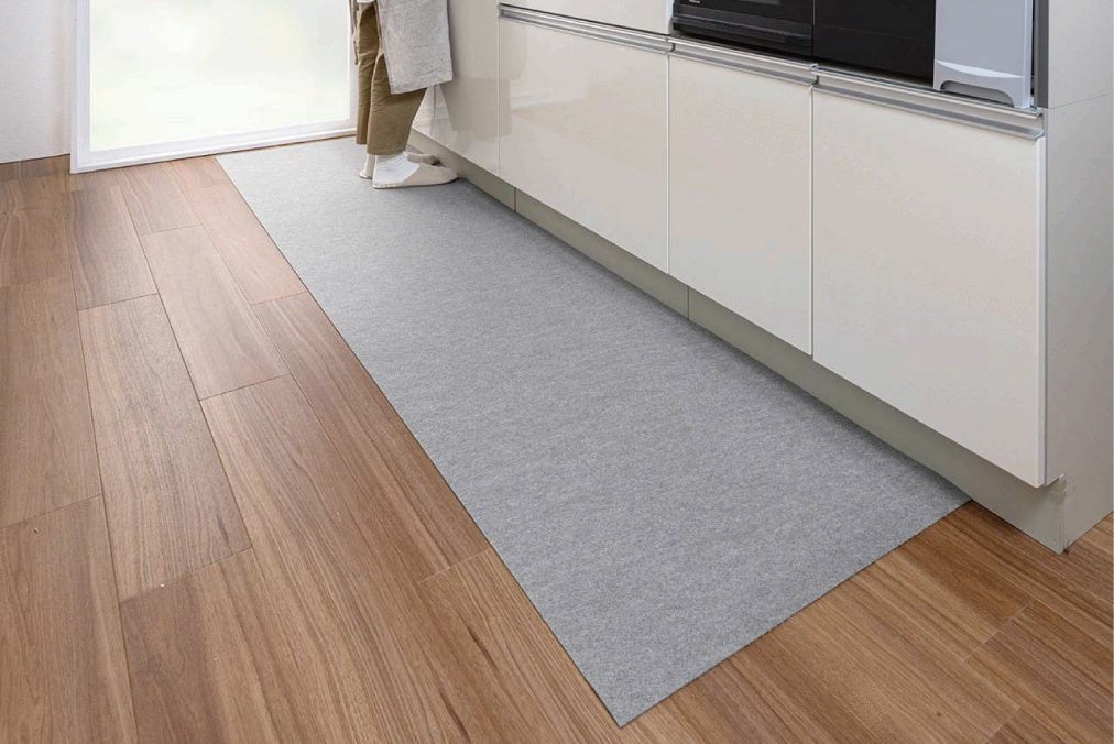 当社のキッチンマットの最大の特長は、裏面が吸着加工でズレにくいことです。アンケート調査結果では、マットのズレがストレスや負担になり、キッチンマットを利用していないという回答が多数確認できました。当社の独自素材「おくだけ吸着®」は、裏面の吸着素材に、目には⾒えない気孔が無数に開いています。マットの上から⼒が加わると、空気が抜けて真空状態になり、吸着⾯が吸盤のようになる仕組みのため、床にピタッと吸着します。動き回ってもマットはズレません。表面には撥水加工が施されており、「掃除や洗濯が手間である」という声に対しても、簡単にお手入れができます。