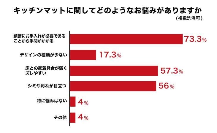 日々の料理で発生した汚れやゴミが付着しやすく、頻繁に手入れが必要なことにフラストレーションを感じている方が最も多く(約73%)、裏面に滑り止めがついていないキッチンマットにおいては床とのズレが頻繁に発生することで、滑りそうになったり、掃除機をかけにくいなどの悩みを抱えている方もいることが分かりました。(約57%)