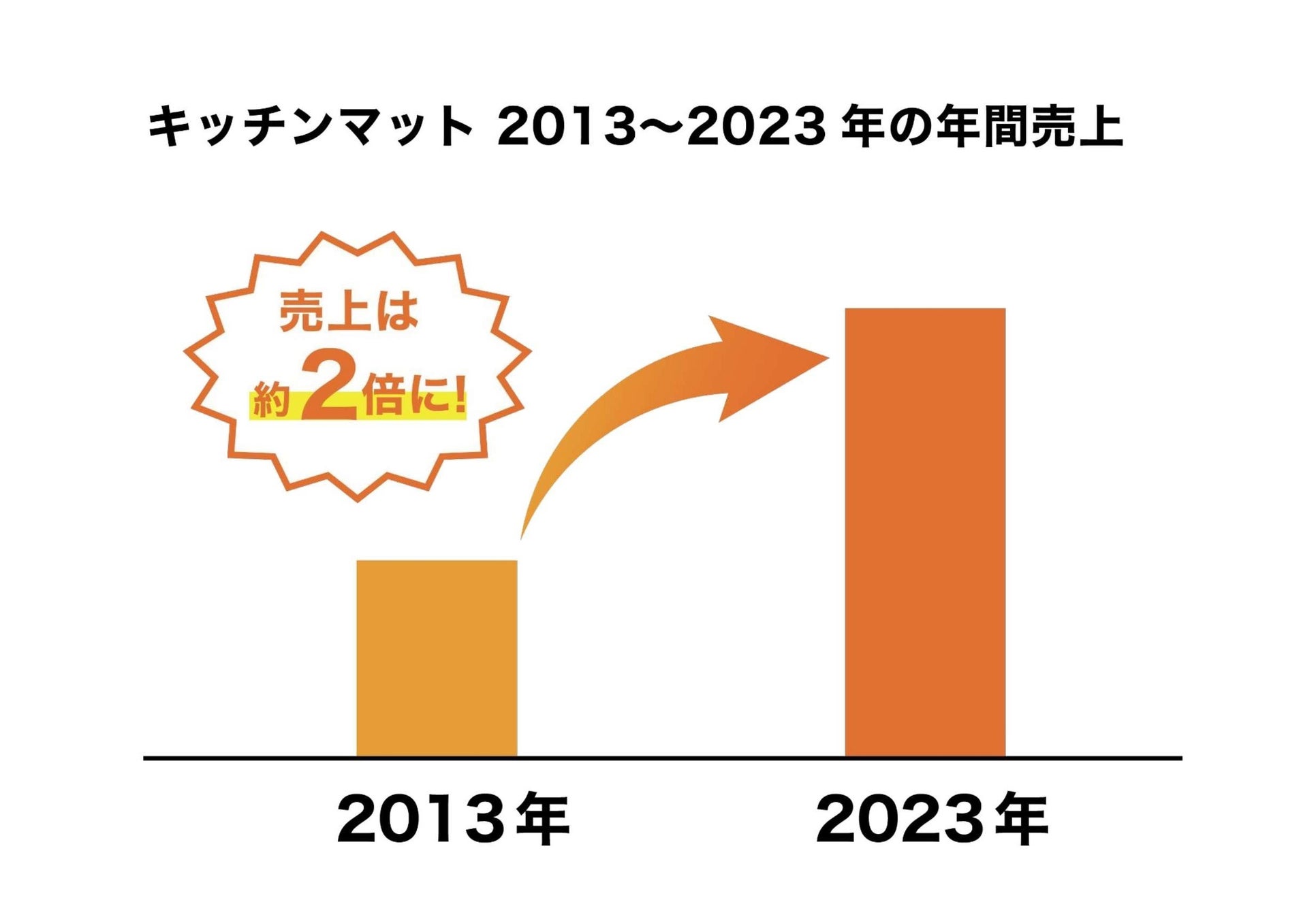 当社は、「おくだけ吸着®」のキッチンマットを販売を開始して以来、顧客ニーズや用途・目的に合わせてラインナップを拡大してきました。現在キッチンマットは計35種販売をしており、直近10年(2013年〜2023年)を比較すると販売数は約7倍・売上は約2倍まで成長しています。