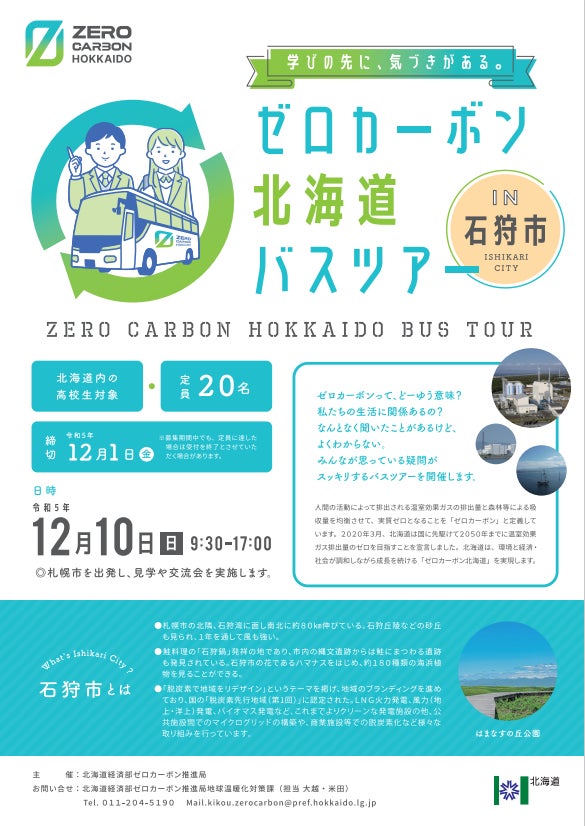 道内の高校生がゼロカーボン北海道等を学ぶうえで、脱炭素の先進的な事例を視察することで、環境に対する理解を深め、自ら学習するためのきっかけの一助とするため、道内高校生向けバスツアーを開催します。