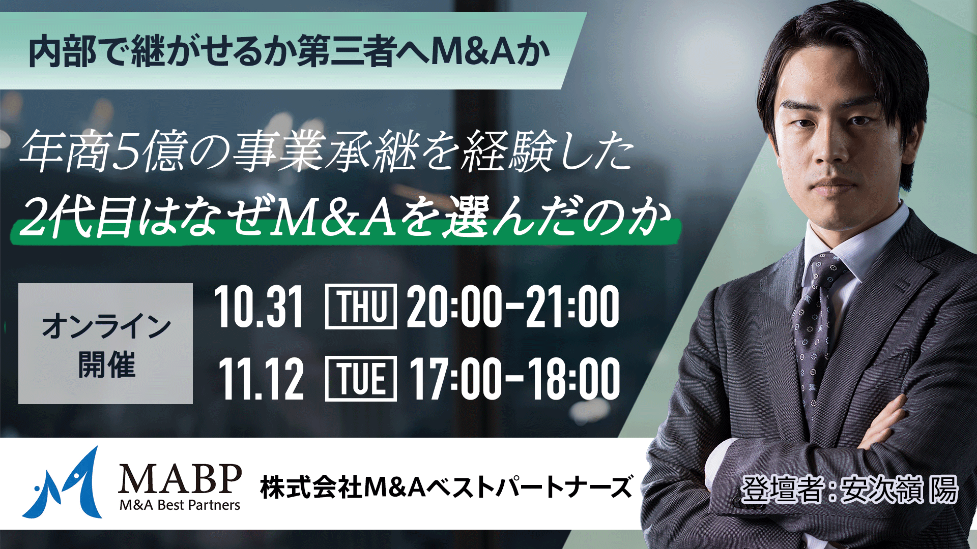 【セミナー】「~内部で継がせるか第三者へM&Aか~年商5億の事業承継を経験した2代目はなぜM&Aを選んだのか」10月31日(木)と11月12日(火)に開催