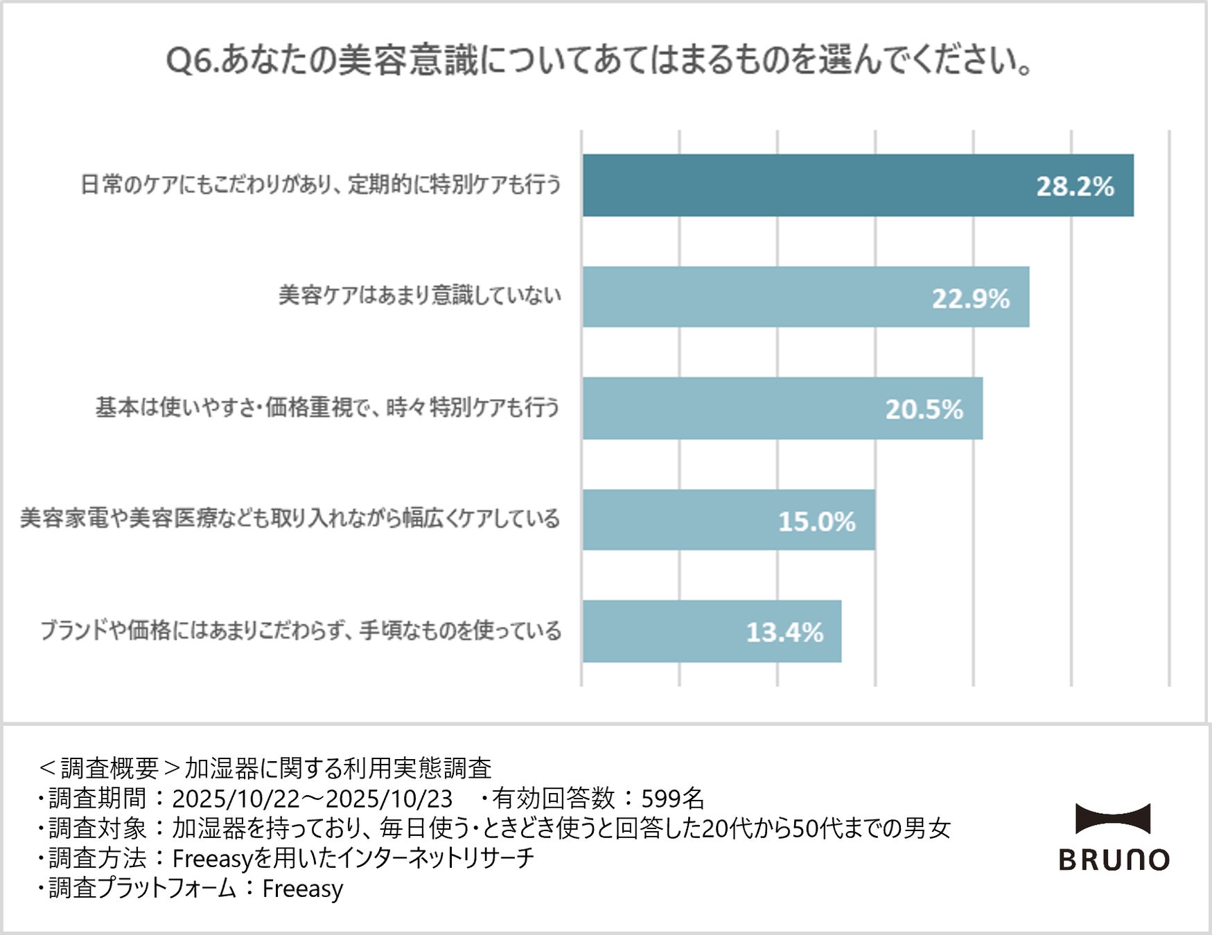 美容意識について、「日常のケアにもこだわりがあり、定期的に特別ケアも行う」と回答した人がもっとも多く28%を占めました。「美容家電や美容医療なども取り入れながら幅広くケアしている」と回答した人も15%見られ、美容意識が高い層が全体の43%となりました。また、その層が加湿器の美容目的利用や効果実感において特に高い傾向がありました。