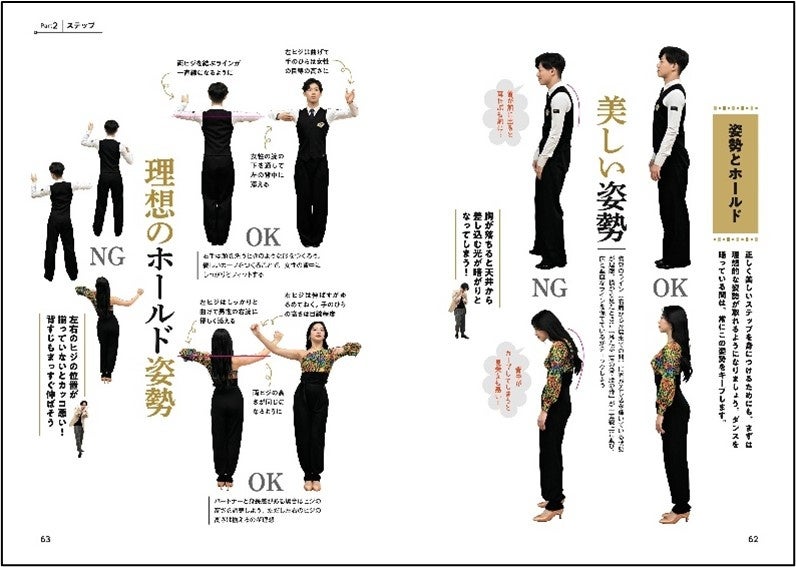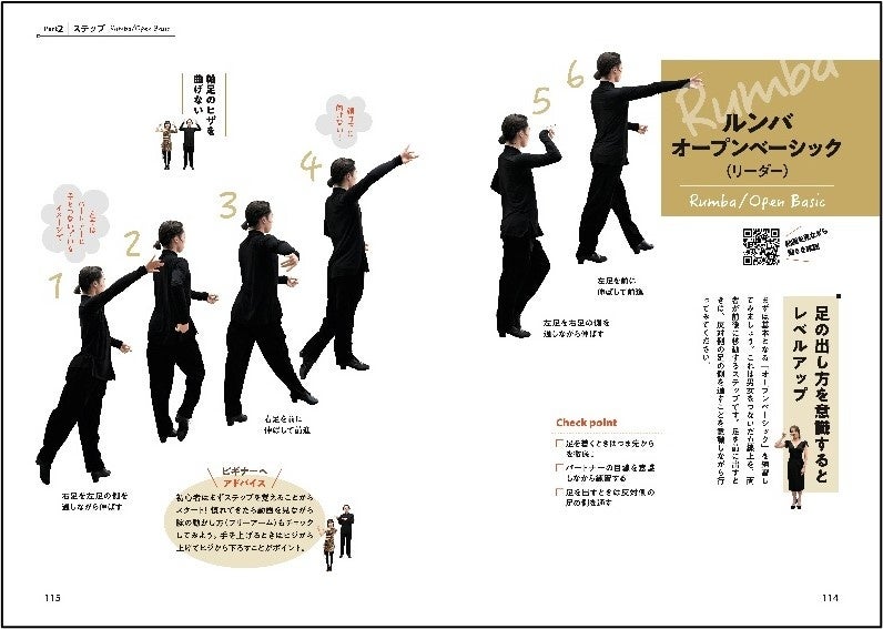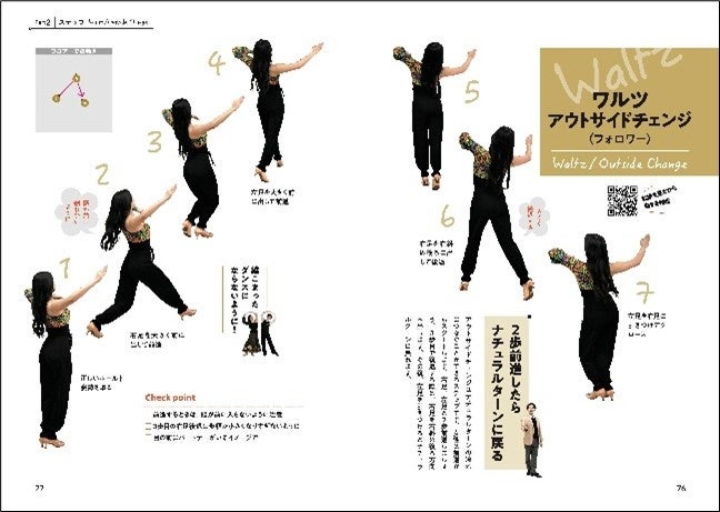 1つひとつのステップにはQRコードが付いており、日本トップダンサーである藤井創太・中村安里組、大西大晶・大西咲菜組によるお手本動画を見ることができます。本で理論、動画で実践と初心者にもわかりやすい2方向からのアプローチでステップを解説しています。