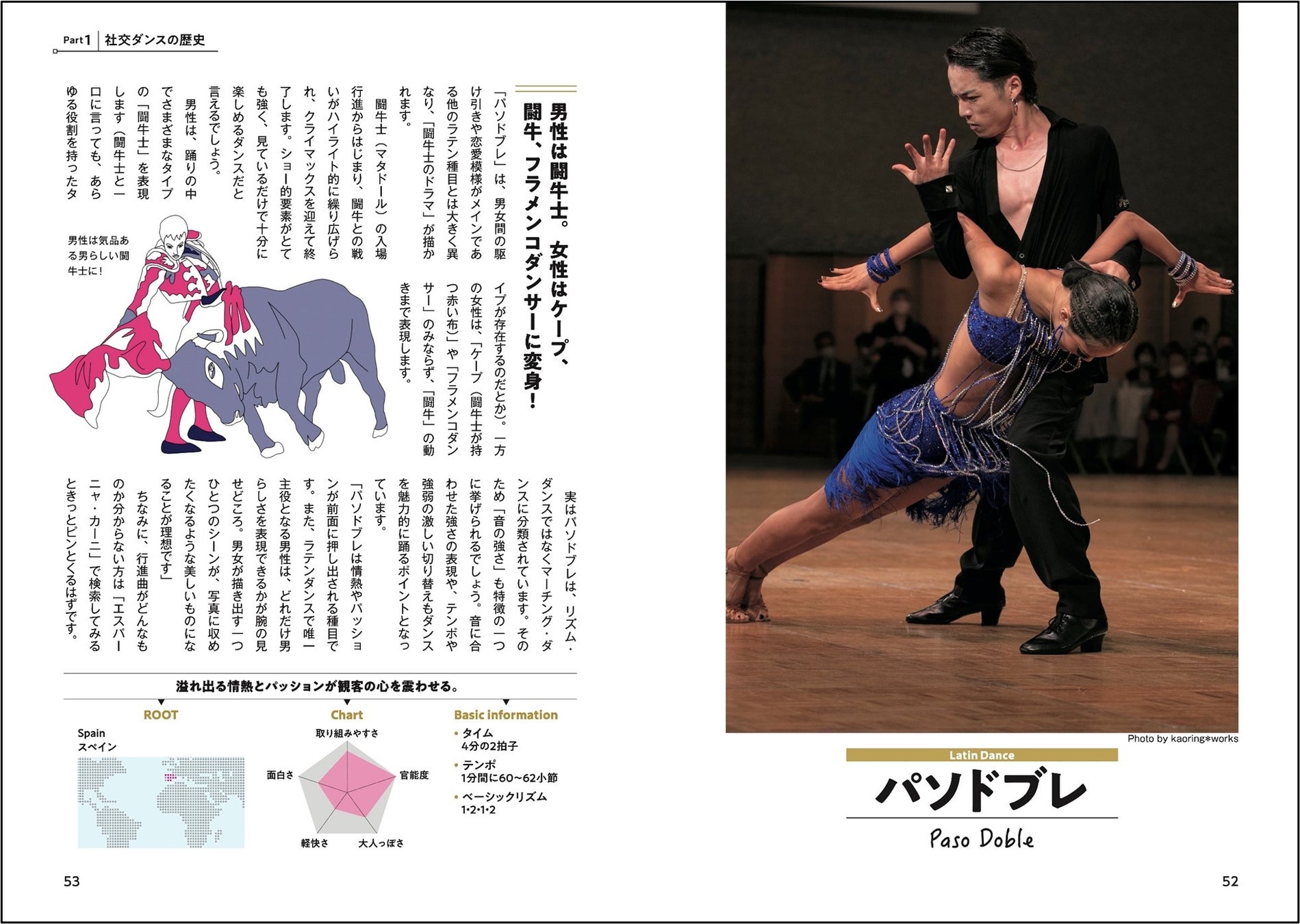 また、ダンスのスタイルの違いや、スタンダードセクション(女性がふわりと長いドレスで踊るもの)とラテンセクション(女性が短く体にフィットしたドレスで踊るもの)それぞれの種目の特徴を解説。歴史やルーツについて、発祥の地やベースとなっている民族舞踊等についても解説し、さらに監修者の経験を踏まえたコメントも掲載しているため、ダンスに初めて触れる人だけでなく、ダンス経験者にとっても楽しめる内容となっています。