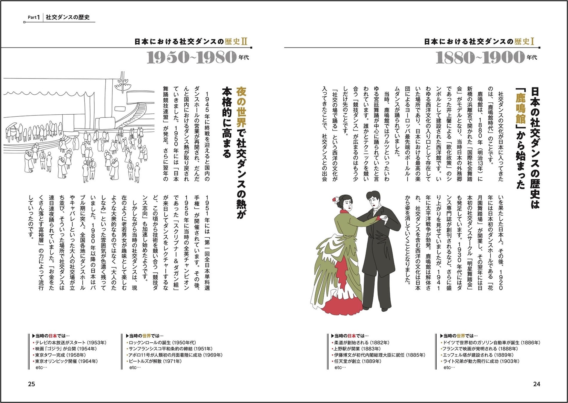 社交ダンスが日本にやってきた「鹿鳴館時代」から現在に至るまで、社交ダンスが社会的にどういった位置づけのものであったのか、どのようなきっかけで盛り上がってきたのか等、詳しく説明しています。