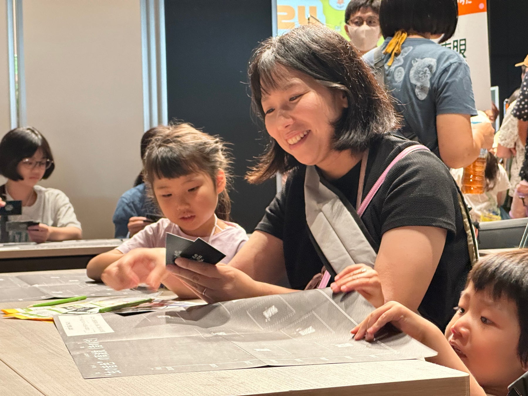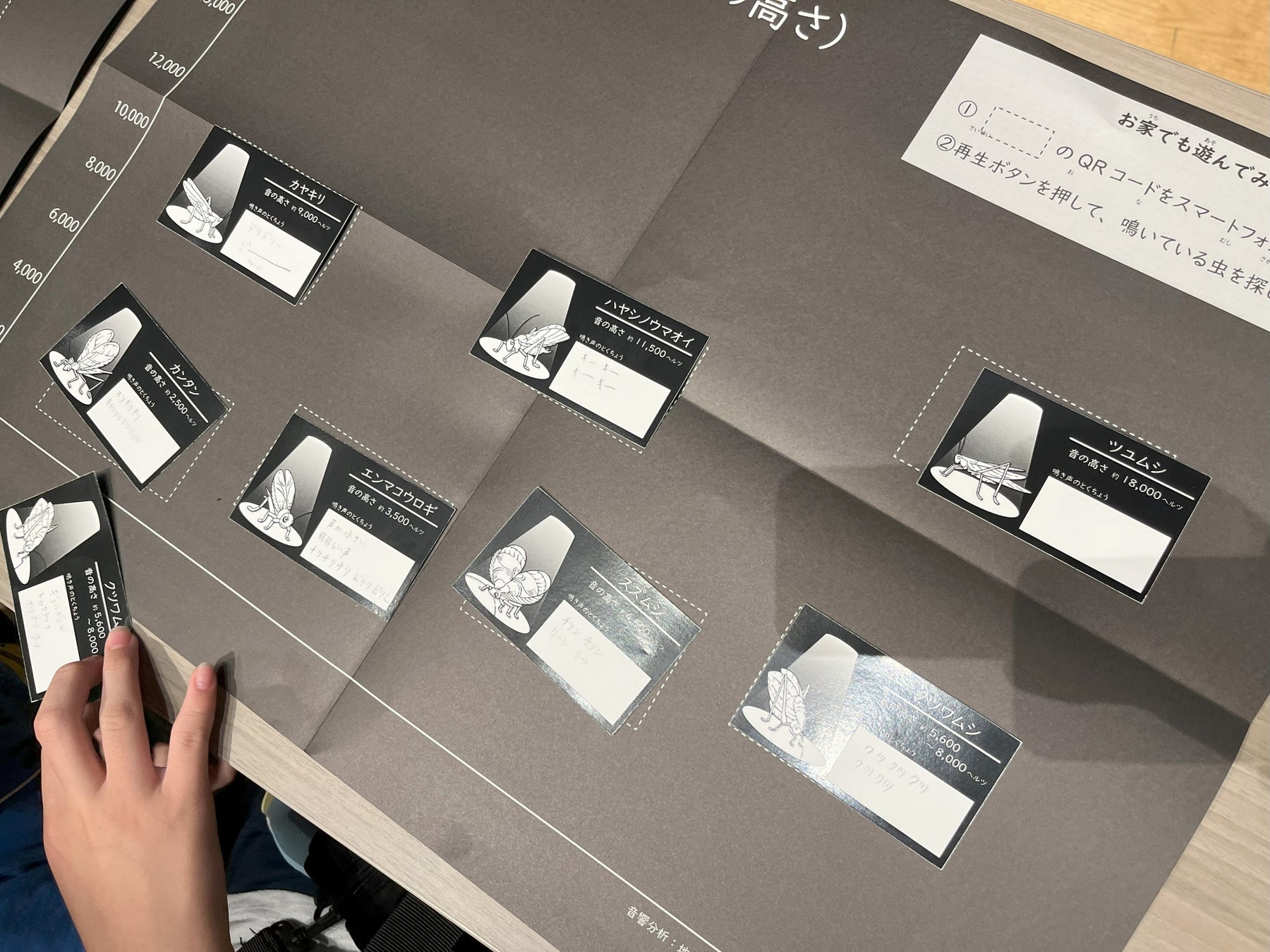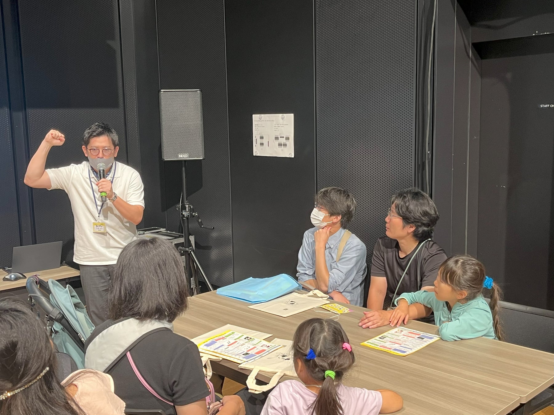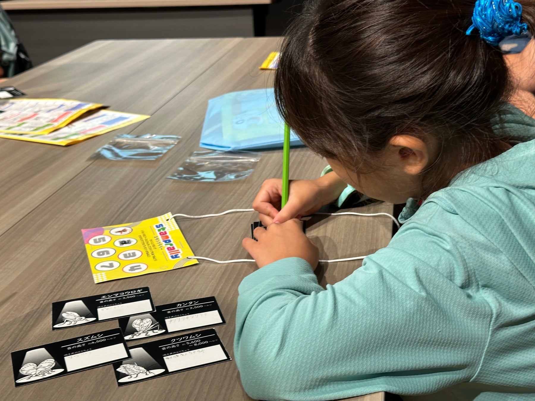 「耳のふしぎ」では、音が聞こえる仕組みや虫の鳴き声には伝えたい事柄によって種類や特徴があることを学んでいただきました。聞こえた虫の鳴き声を表現するワークを行った際には、エンマコオロギの鳴き声を「チリチリチリ」、スズムシの鳴き声を「リーンリーン」と表現。子どもたちが鳴き声を言葉で書き表そうと一生懸命に取り組む様子が印象的でした。また、鳴き声を聞いて虫の名前を当てる「むしのね かるた」のワークでも、子どもたちから「カヤキリ︕」という元気な声。自分たちが表現した鳴き声をヒントにして全問正解したご家族もいらっしゃいました。「目のふしぎ」では、目が見える仕組みについて学んだ後に、目が見えづらい状態を疑似的に体験。“見える”を守るために大切なこととして、スマホやタブレットを見る時は連続で画面を見ないようにすることや、目に良い食事について知っていただき、子どもたちに目を大事にする意識を育んでもらいました。