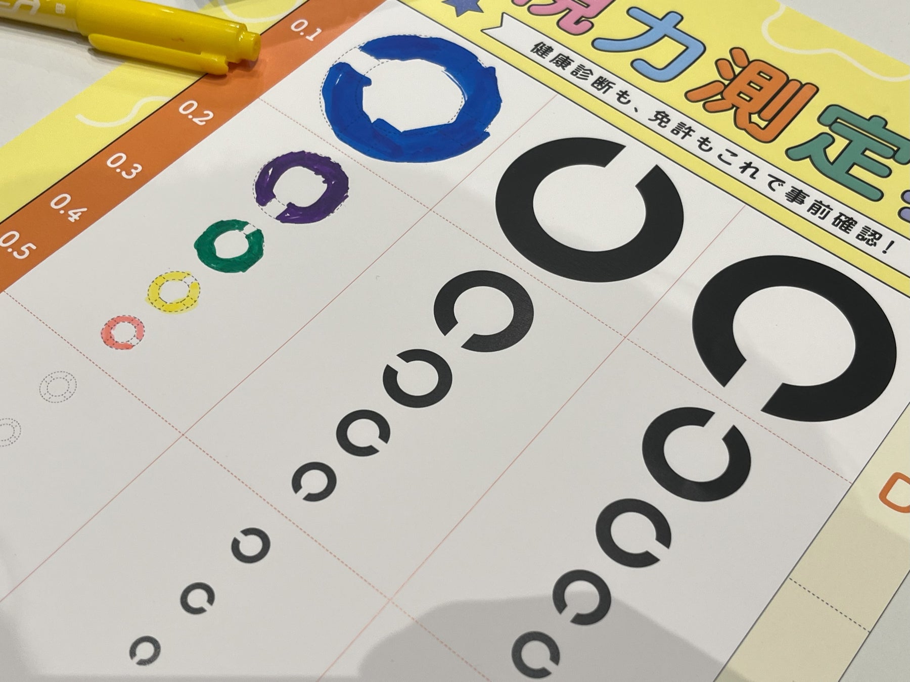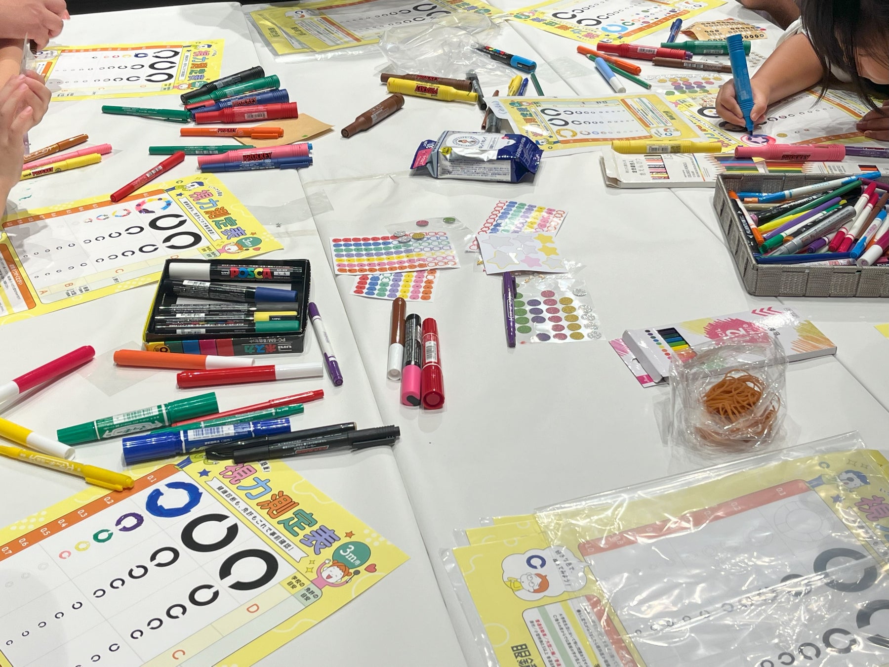 子どもたちがたくさんの色のマジックペンやシールを使って、自分だけのオリジナル視力表を制作。視力表のランドルト環が塗り絵の形式になっており、子どもたちが自由に好きな色を使ってカラフルな視力表を完成させていました。制作したオリジナル視力表はそのままプレゼント。ご自宅でいつでも視力をチェックすることができます。また、ブース内に環が回転して見える錯視の絵を展示。視覚の不思議な体験を通して、新しい発見ができる楽しいワークショップとなりました。