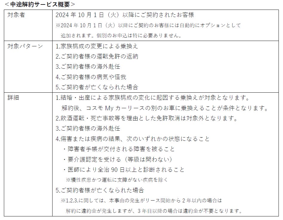 コスモエネルギーホールディングス株式会社(代表取締役社長:山田 茂)のグループ会社であるコスモ石油マーケティング株式会社(代表取締役社長:森山 幸二)は、カーリースサービス「コスモMyカーリース」に、お客様のライフステージの変化に対応するべく、2024年10月1日より中途解約サービスを追加します。中途解約サービスとしては業界初となる、家族構成の変化による乗換えやご契約者様の海外赴任を含む合計5パターンの事由に対し、解約金なしの乗換え・返却が可能となります。10月1日以降にご契約される方は、もれなく手続等不要で適用されます※。