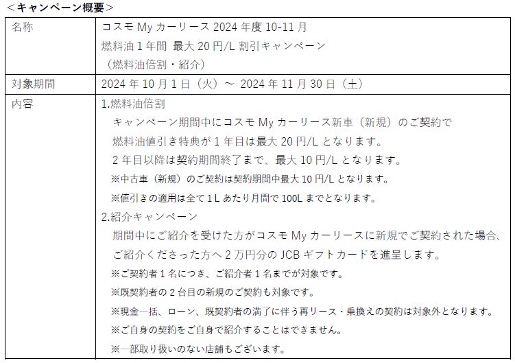 「コスモMyカーリース」ご契約のお客様には特典として通常最大5円/L、キャンペーン時には最大10円/Lの燃料油割引を適用しておりますが、さらに、中途解約サービス開始に合わせて、2024年10~11月の期間限定で「燃料油1年間 最大20円/L割引キャンペーン」を実施します。併せて「紹介キャンペーン」も実施します。
