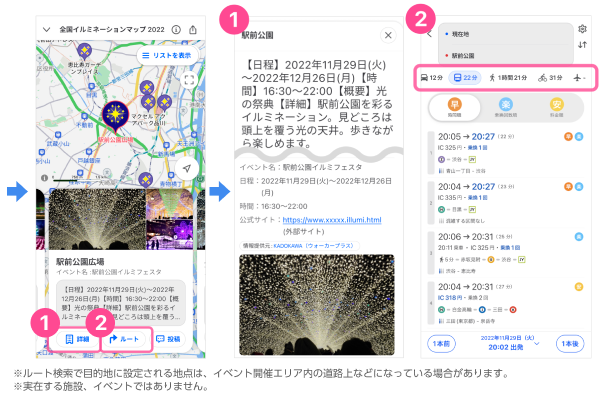 ・地図上で、調べたいスポットのピンをタップすると画面下部に、「詳細」ボタン、「ルート」ボタン、「投稿」ボタンが表示され、ボタンをタップすると遷移します。「詳細」ボタンをタップすると、イルミネーションスポットの詳細情報が表示(※6)されます(施設名・開催日程・開催時間・概要・詳細・公式サイトなど)。