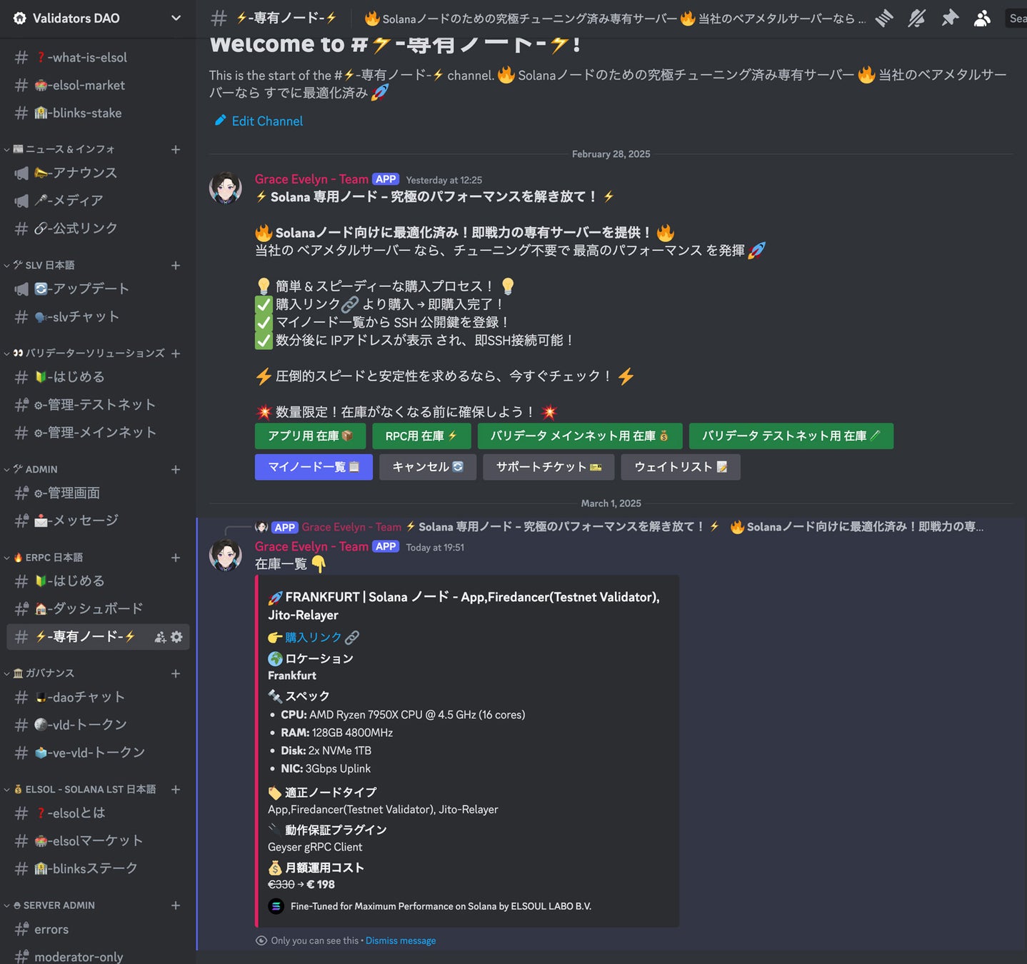 ELSOUL LABO B.V.(本社: オランダ・アムステルダム、代表取締役 CEO: 川崎文武)は、Solana 分散型インフラサービス「Validators Solutions」ならびに「ERPC(Enhanced Solana RPC)」を運営する当社の知見を活かし、Solana テストネット・メインネット・RPC 向けに最適化されたベアメタルサーバーの提供を開始しました。これを記念し、期間限定でオープニングセールを実施いたします。