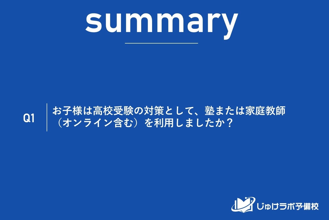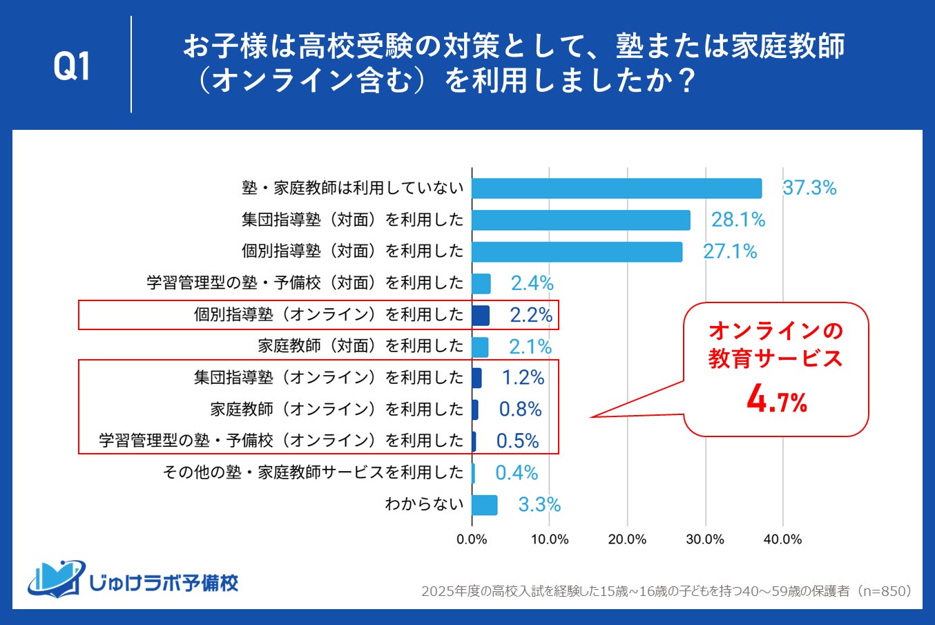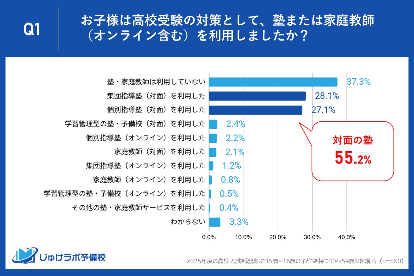 じゅけラボ予備校(所在地:大阪市北区、代表取締役:後藤智則)は、2025年度の高校入試を経験した15歳~16歳の子どもを持つ40~59歳の保護者850名を対象に、「高校受験の対策としての学習支援サービスの利用実態」に関するアンケート調査を実施しました。