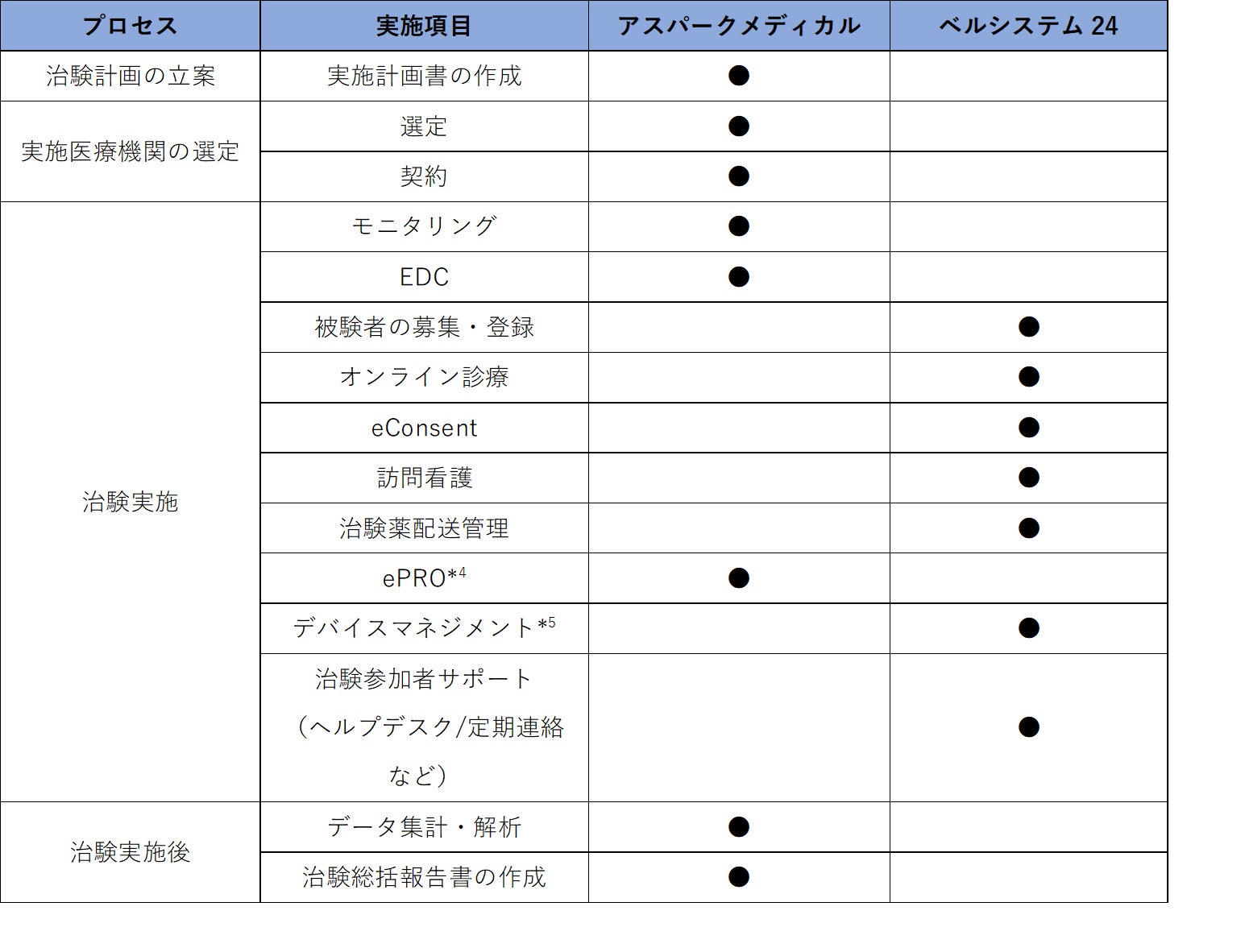 ベルシステム24は、遠隔の被験者に対し、医師から治験の説明や同意取得を行う「eConsent」や遠隔の被験者と医師の間で診療を行う「オンライン診療」などのDCTサポートサービスの提供と、被験者からの問い合わせ受付や利用システムに関するヘルプデスク、服薬状況や体調確認のためのアウトバウンドによるヒアリングなどを担い、DCTを含めた治験の円滑な実行をサポートします。AspMDCは、治験計画の立案から実施医療機関の選定・契約、実施中のモニタリング業務をはじめ、EDC*3の構築とデータマネジメント、統計解析および総括報告書の作成や当局への申請支援までの一連の治験支援スキームと共にアカデミアに対する臨床研究支援スキームを提供します。