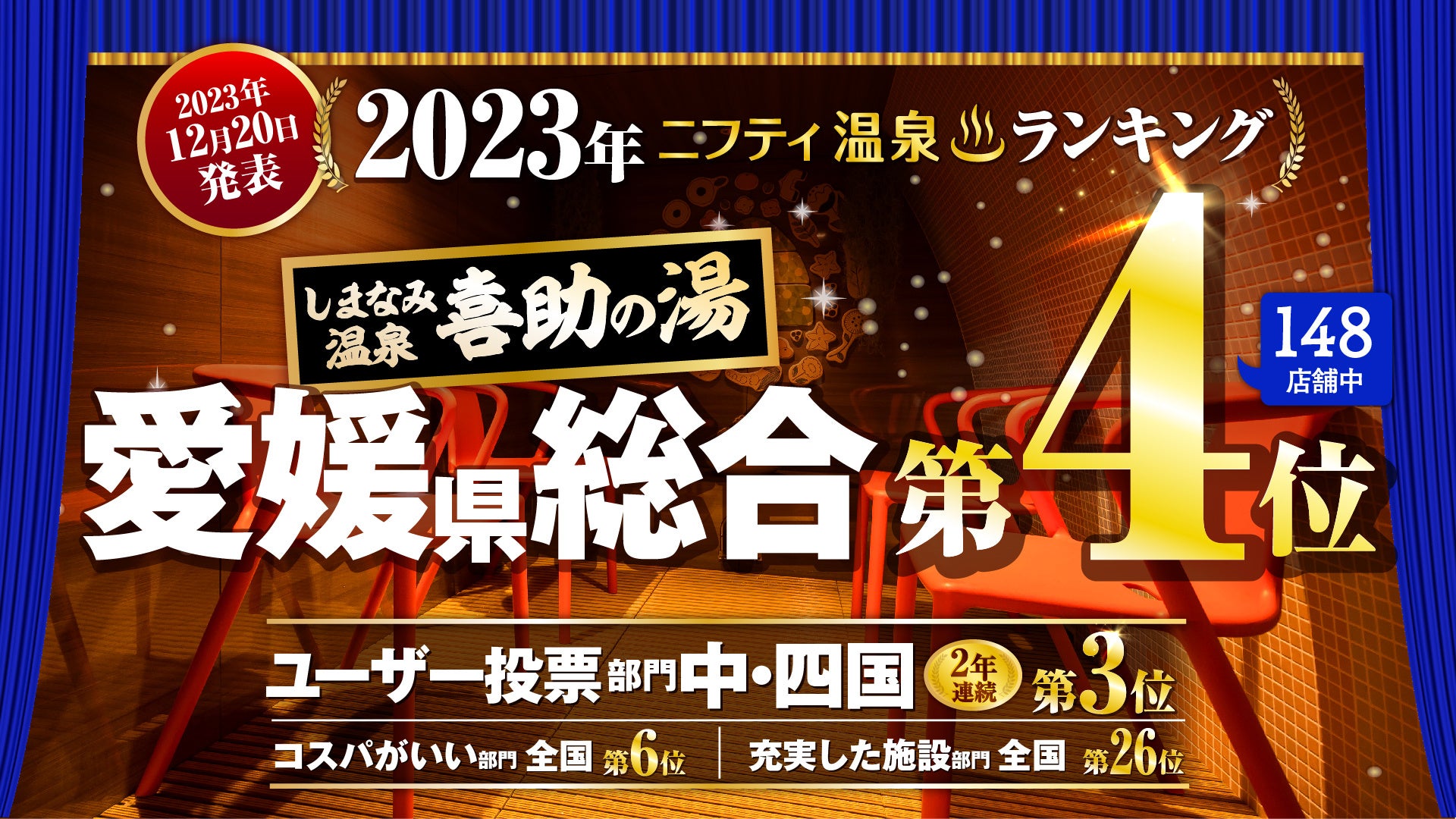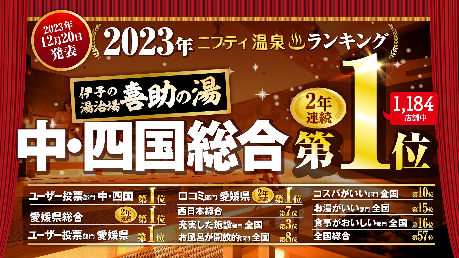 「伊予の湯治場 喜助の湯」(愛媛県松山市)、「しまなみ温泉 喜助の湯」(愛媛県今治市)が、2023年12月20日に発表された「ニフティ温泉年間ランキング2023」において数々の賞を受賞しました。
