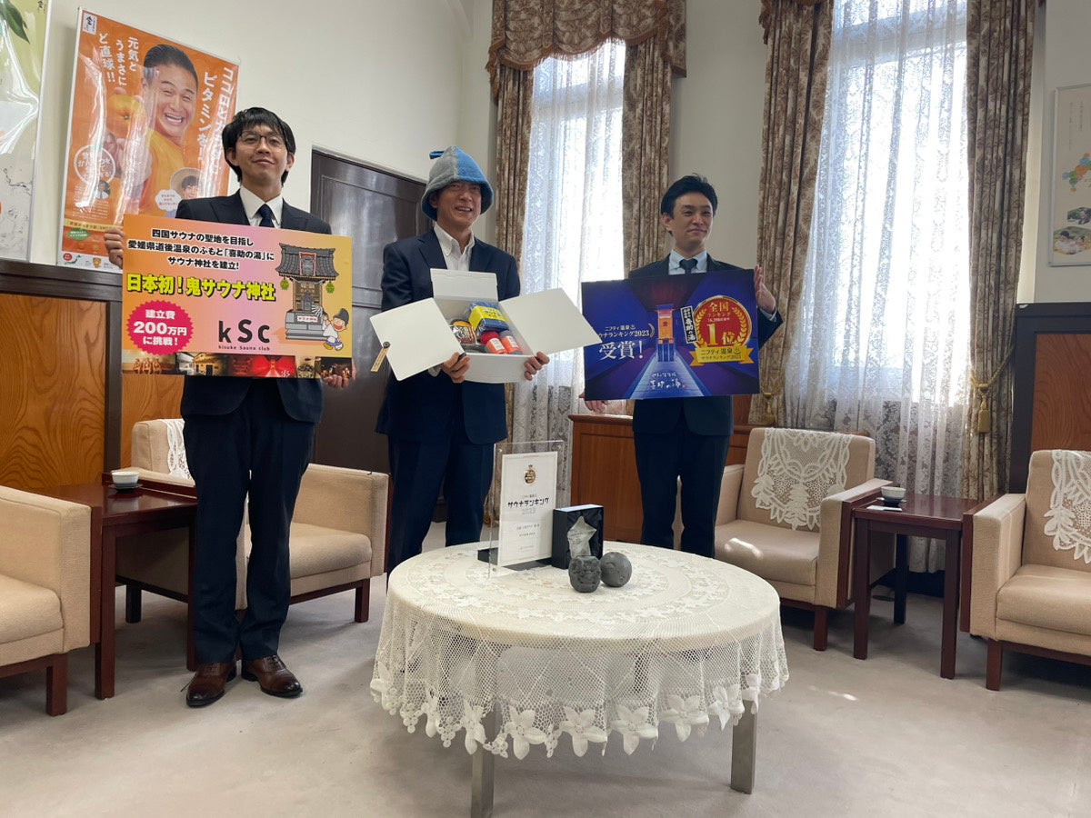 ▲中村時広 愛媛県知事(中央)、愛媛県庁にサウナ日本一受賞の報告訪問 2023年3月14日