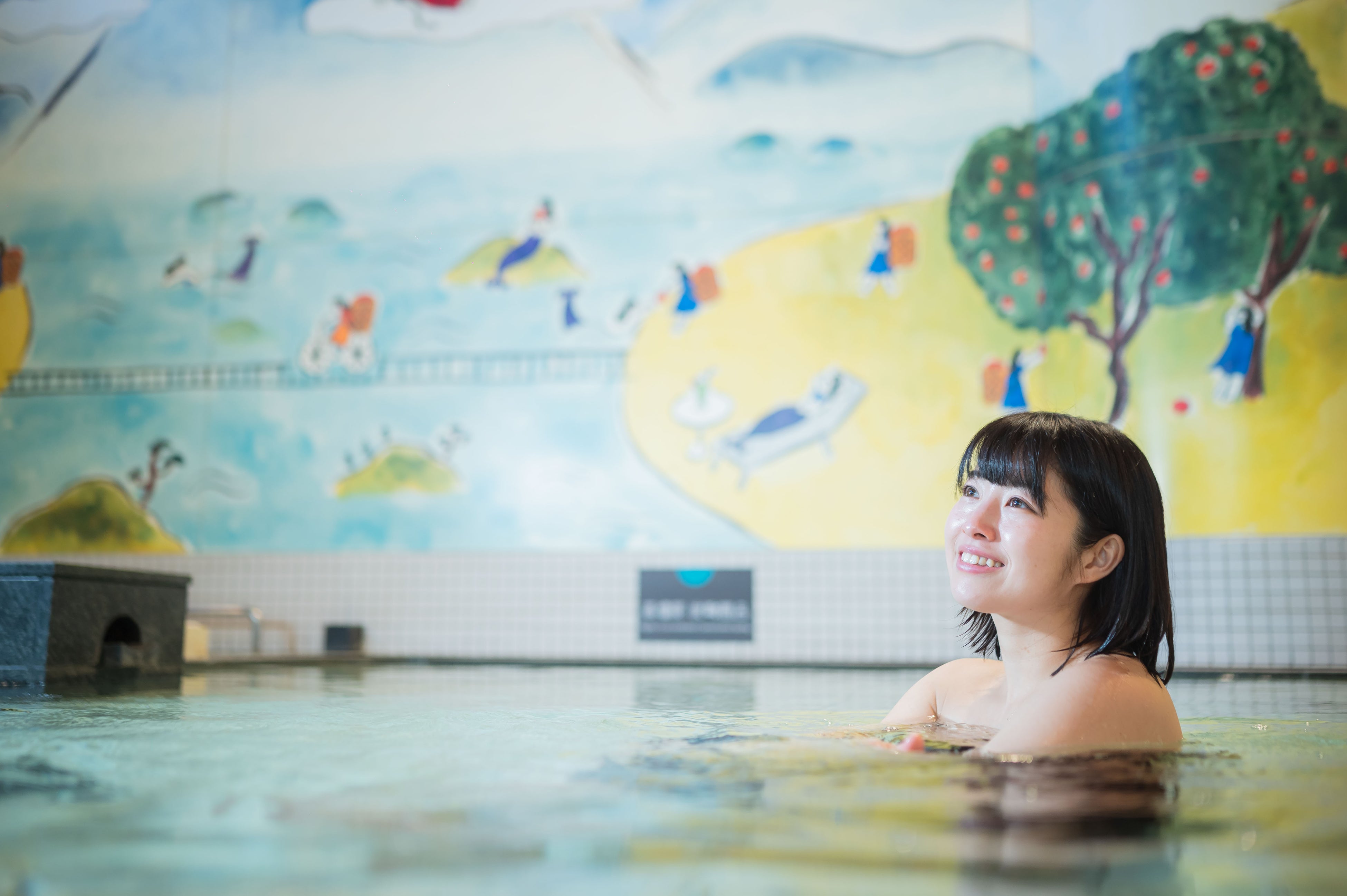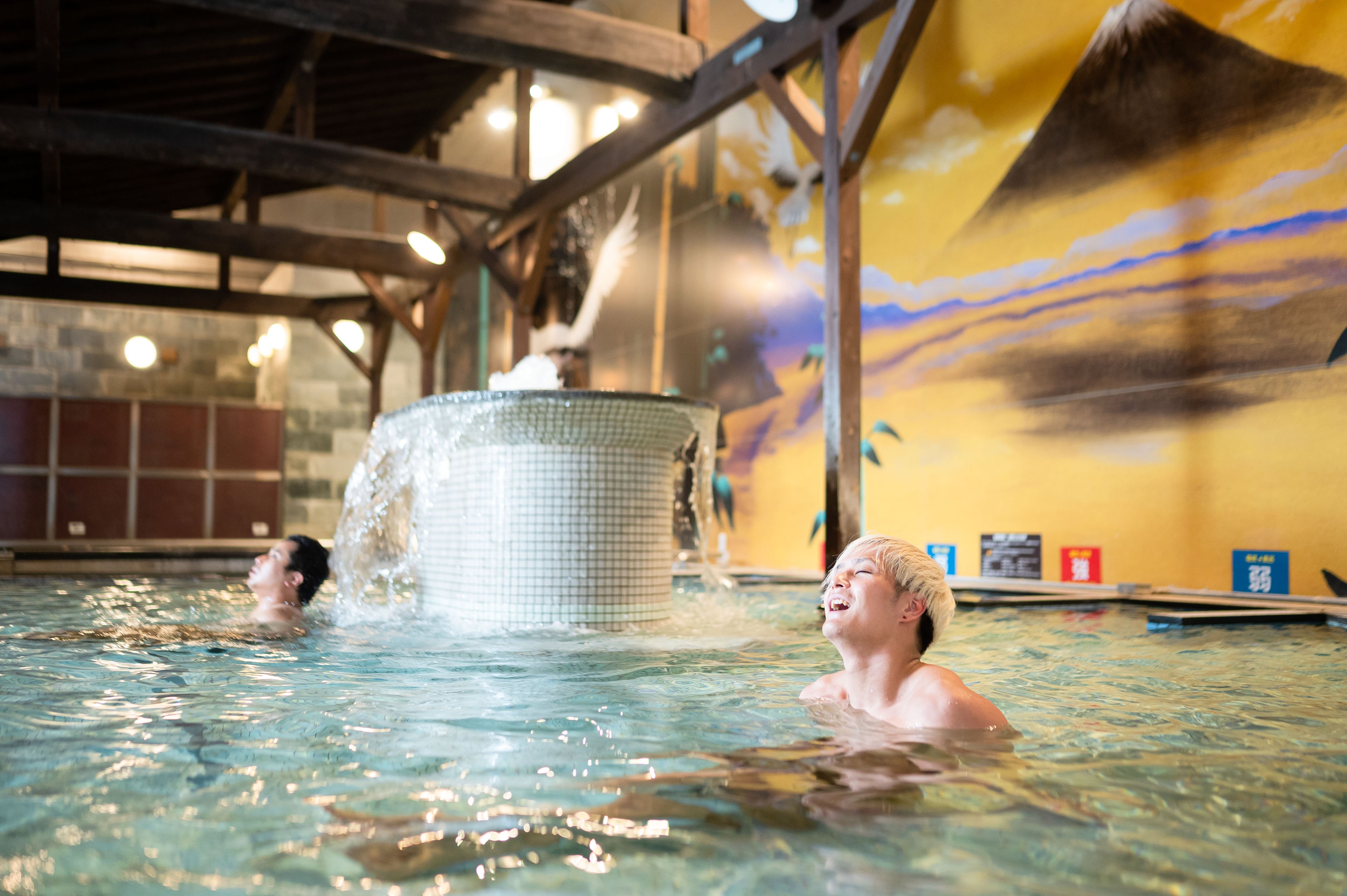 和の雰囲気に包まれる館内は、どこか懐かしい世界観。高濃度炭酸泉が人気の浴場は、西日本最大級の広さを誇ります。2020年8月には、四国最大級の岩盤浴「喜助の蒸」を温泉2階エリアを増床しました。さらに、韓国サウナ「汗蒸幕」(はんじゅんまく)など5つの異なるサウナを開業しています。