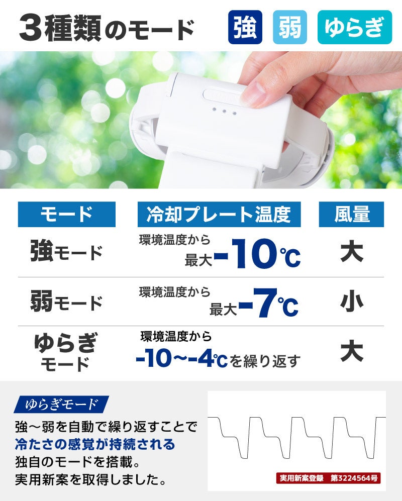 本製品は首に巻きつけて使うウェアラブル型のクーラーです。2015年にサンコーが生み出したネッククーラーシリーズは累計110万台を突破。2024年の最新作は冷却プレートの冷却だけでなくファンを搭載。冷却プレートと風のチカラでダブルで涼しくなります。使い方は本体を首から掛け、背面部の電源を入れると左右のプレート部分が冷却、それとともにファンが回転し風を発生します。首元に当たる風と、左右の冷えたプレートでひんやりと涼しくなることが出来ます。冷却システムは小型の冷蔵庫と同じペルチェ冷却方式を採用。電気を流すと冷却する仕組みの為、長時間使用時でも冷却効率が落ちずに使えます。強、弱、ゆらぎモードの3段階切り替えが可能で、プレート温度は外気温より強モード時約-10度、弱モード時約-7度。ゆらぎモードは強と弱を自動で繰り返し、冷感を持続させます(実用新案登録第3224564号)。ファンもモードに応じて風力が変化します。