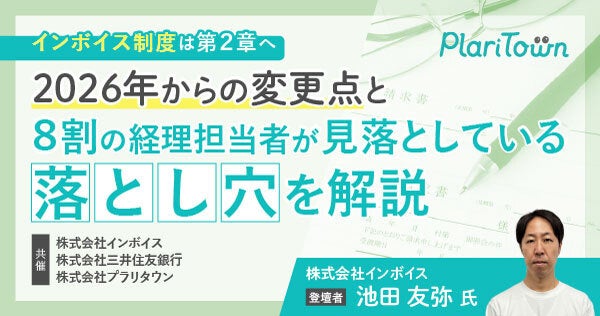 この度、株式会社インボイス(代表取締役社長:仁多見 斎 本社:東京都千代田区)は2025年11月27日(木)に開催される、 株式会社三井住友銀行(頭取CEO:福留 朗裕 所在地:東京都千代田区丸の内)と、株式会社プラリタウン(代表取締役社長:並木 亮 所在地:東京都中央区八重洲)主催のインボイス制度をテーマとした経理向けオンラインセミナーイベントへ登壇いたします。
