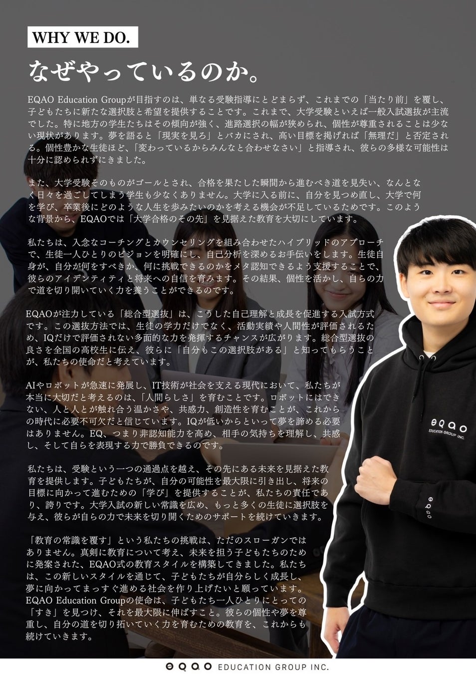 EQAO Education Groupは、「教育の常識を覆す」ことを目指し、子どもたちに新たな選択肢と希望を提供する教育機関です。従来の大学受験が一般入試選抜に偏る中で、個性豊かな生徒が自分らしく進む機会が限られ、地方ではその傾向が強く見られます。私たちは、大学合格をゴールとせず、その先の未来を見据えた教育を大切にし、生徒が自分のビジョンを明確にし、自信を持って進む力を育てます。
