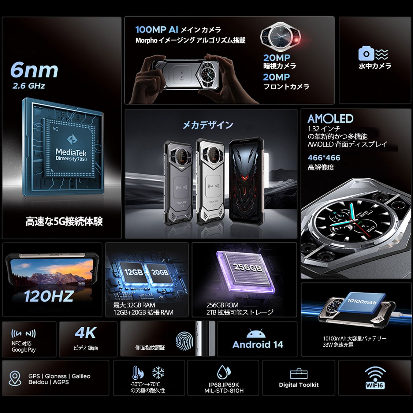 DOOGEEは、日本市場に向けて新たに革新的な5G対応Rugged Phone「DOOGEE S200」を発表しました。防水、防塵、防衝撃の特性を備えたこのデバイスは、最先端の技術と強力な性能を兼ね備え、あらゆる環境で高いパフォーマンスを提供します。特に、Android 14とDimensity 7050プロセッサを搭載し、5G対応で高速な通信とアプリの処理能力を実現しています。
