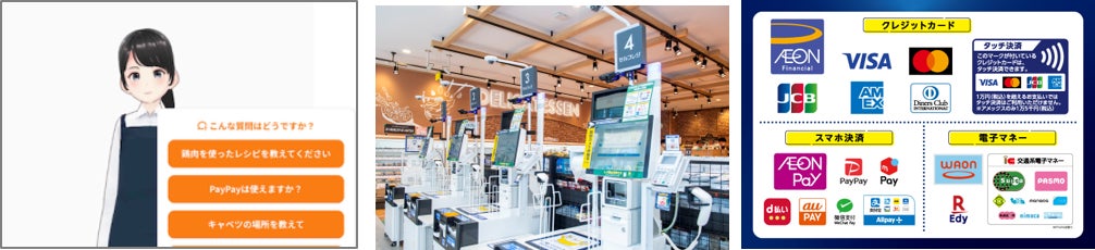 お客さまからのご質問にお答えする、生成AIを活用したコンシェルジュを導入いたします。また有人レジに加え、フルセルフレジを24台設置し、AEON Payを含む各種決済方法に対応することで、さらに快適なお買い物・決済環境をご用意いたします。