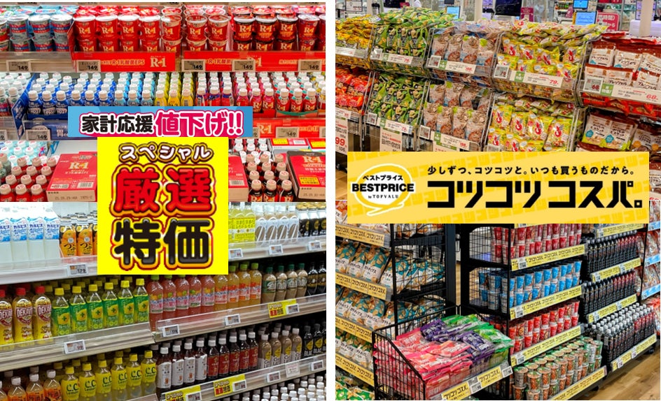 日配・加工食品コーナーでは、U.S.M.Hグループ共同仕入れも活用し、人気商品をお求めやすい価格でご提供する「スペシャル厳選特価」「厳選特価」を約900品目に拡大して実施いたします。また、トップバリュ ベストプライス等のプライベートブランド商品を約1,200品目取り揃え、応援価格で毎日の食卓をしっかりとサポートいたします。