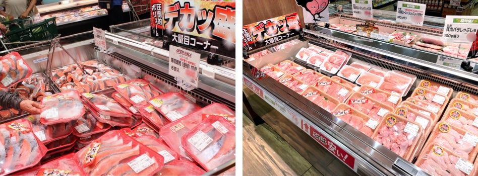 生鮮各コーナーでは、果物、豚肉・鶏肉、冷凍の魚介類など、大容量の商品をお求めやすい価格でご提供いたします。ファミリーでのお買い物はもちろん、まとめ買いにも便利な商品を豊富に品揃えいたします。