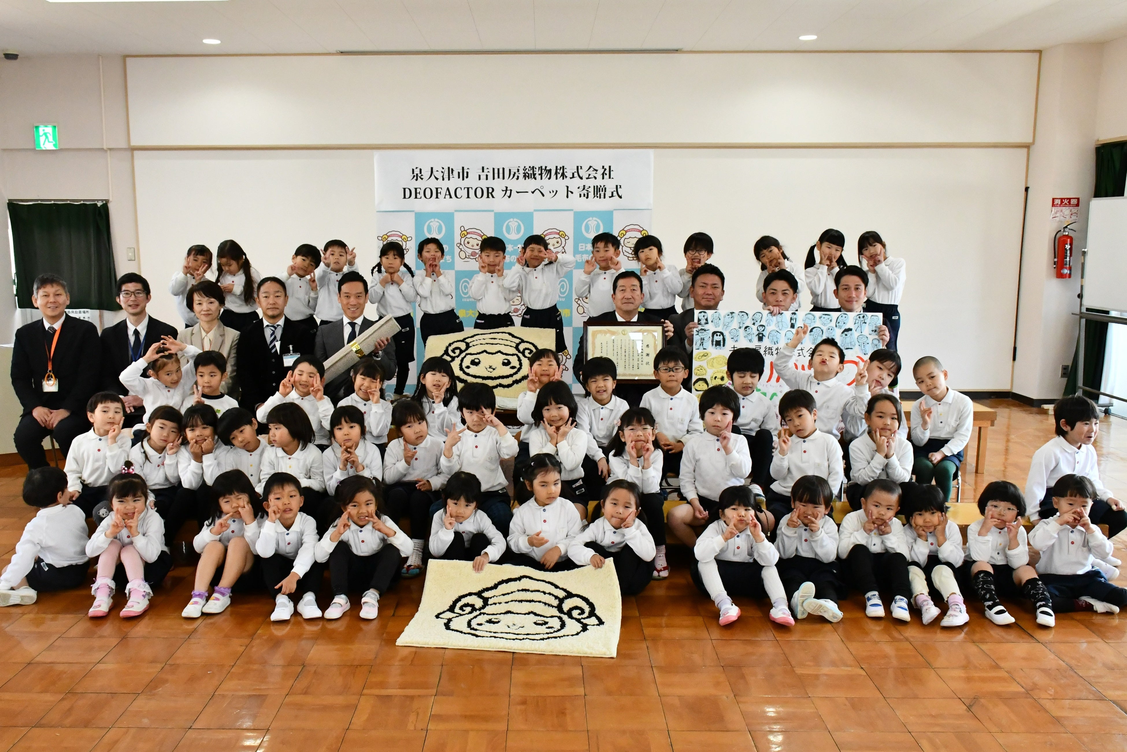 大阪府泉大津市(市長:南出賢一)は、地元繊維企業である𠮷田房織物株式会社(泉大津市、代表取締役社長:𠮷田裕紀、以下「𠮷田房織物」)から、高機能なDEOFACTOR(デオファクター)カーペットの寄贈を受け、市立旭幼稚園において寄贈式を開催しました。