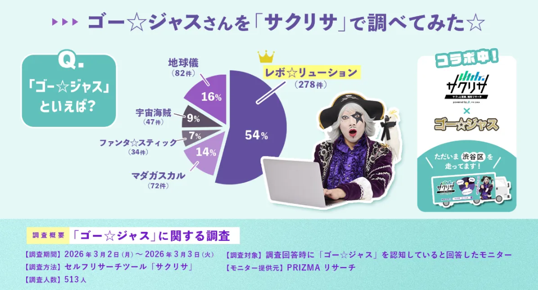 プロモーションにおける新しい戦略設計の概念「データフォースプロモーション」を展開している株式会社PRIZMA(本社:東京都渋谷区、代表取締役:杉本昂輝)は、ブラウザ上で完全完結するセルフリサーチツール「サクリサ」と、お笑い芸人・ゴー☆ジャスのコラボレーションを記念したアドトラックの運行を開始いたしました。