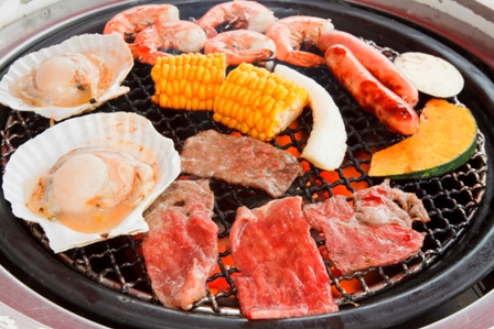 牛肉のカルビ、牛肉のサーロイン、牛肉のリブロース、ラムロール、ポーク、ポークスペアーリブ、ソーセージ、殻つき帆立貝、小海老、赤いか、ししゃも、野菜6種など合計17種類