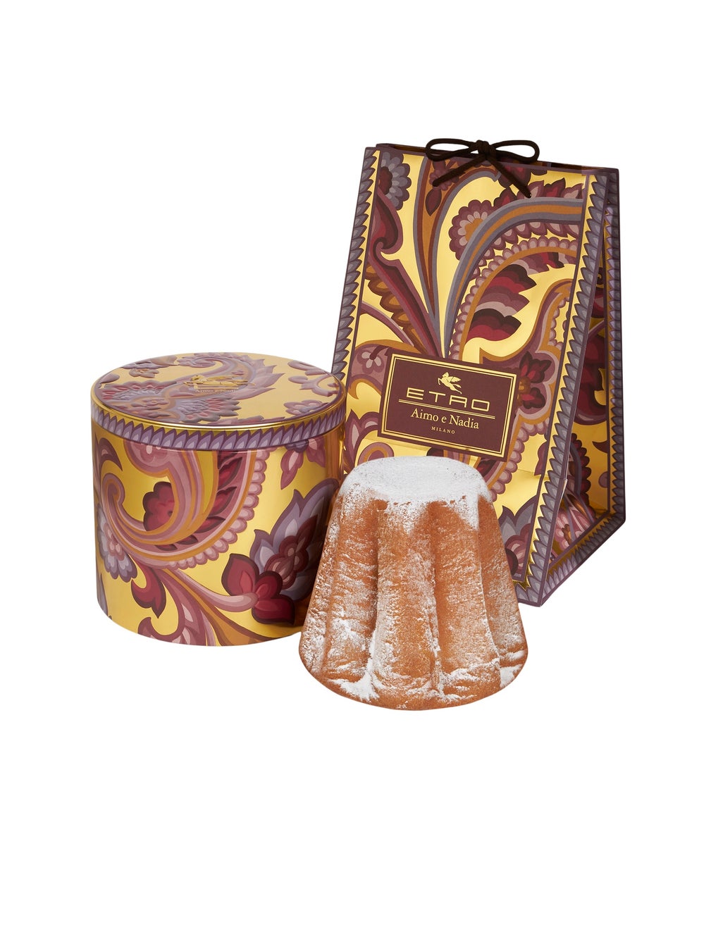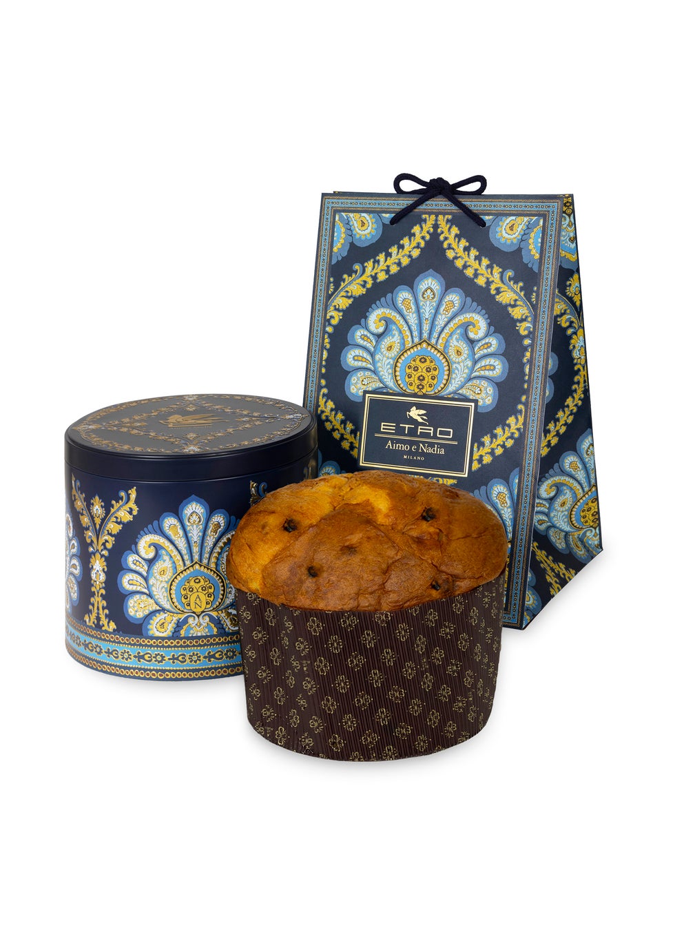 このパネットーネは、エトロ 2025 ホリデーコレクションのペイズリーとフローラルモチーフをあしらった、エレガントなサテン仕上げのメタルボックスに収められています。