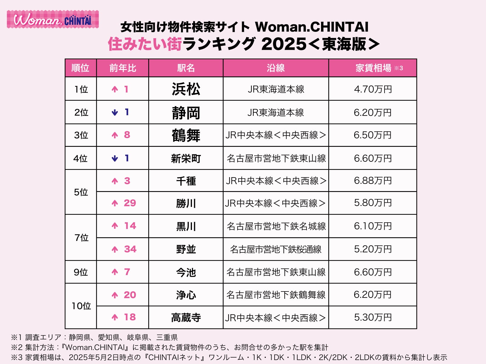 お部屋探しのリーディングカンパニー、株式会社CHINTAI(本社:東京都港区、代表取締役社長 奥田倫也)は、女性向け賃貸物件検索サイト『Woman.CHINTAI』に掲載された賃貸物件のうち、東海エリア(静岡県、愛知県、岐阜県、三重県)のお問合せ数を集計した「住みたい街ランキング2025 東海版」を発表します。