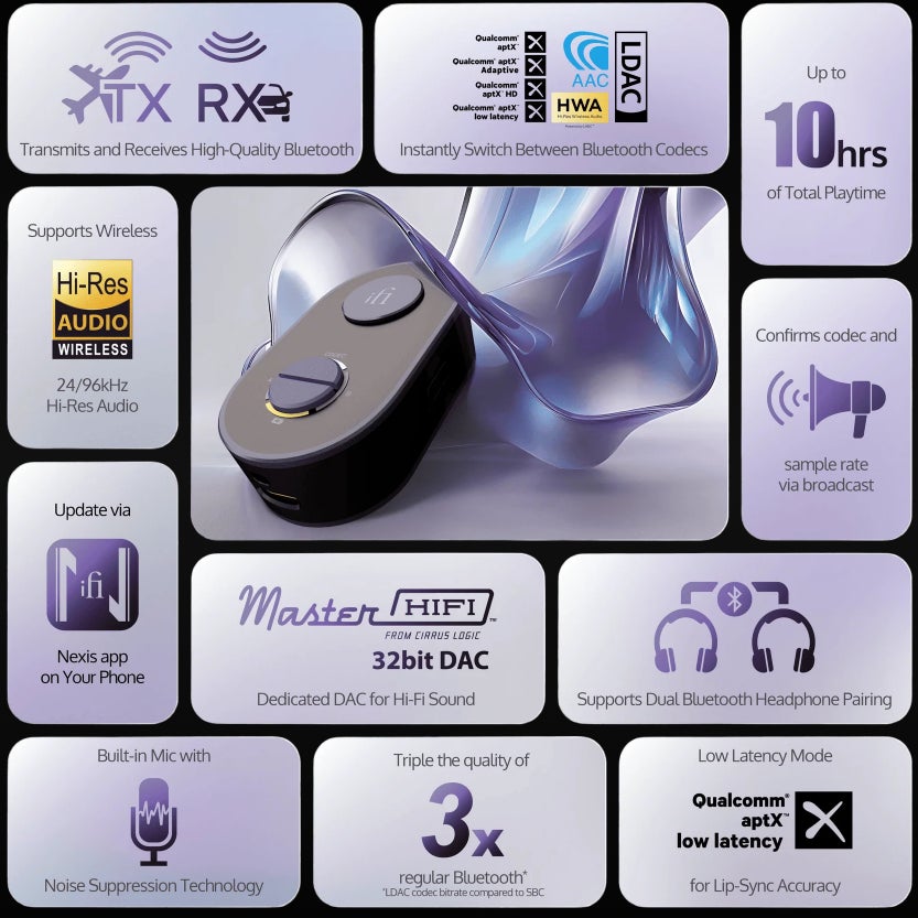 送信(TX)モードでは、ワイヤレスヘッドホンで機内エンターテイメント(映画・音楽・ゲームなど)をお楽しみいただけます。まるで自宅のリビングのように、音質が劇的に変化します。受信(RX)モードでは、受賞歴のある Hi-Fiアーキテクチャを搭載した優れたBluetoothで、車内のサウンドシステムをアップグレードできます。