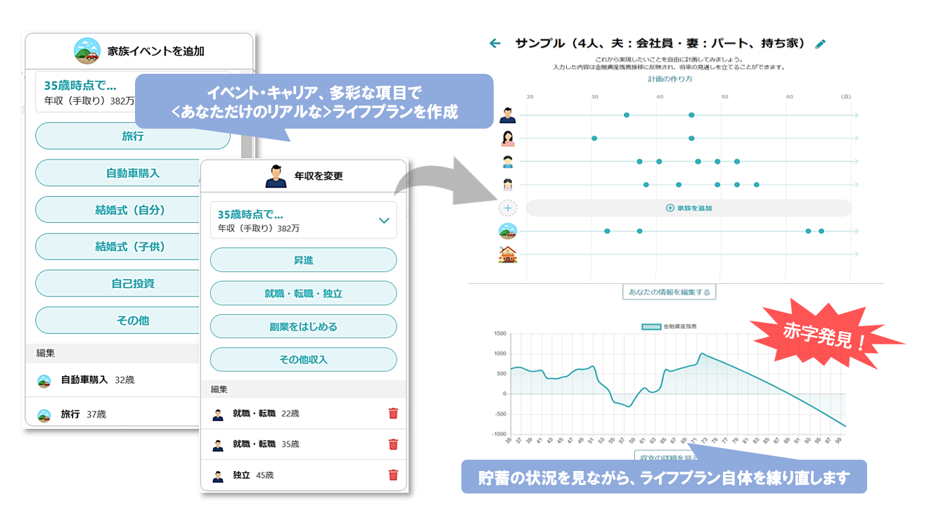 従来のシミュレーションツールでは、登録情報の更新時に担当者との面談を行う必要がありましたが、マネパスではその必要がありません。人生の変化に伴い、お客様に最適な保障や資産形成を紹介し、解決策をお伝えします。ご希望に応じて、ファイナンシャルプランナーへ無料相談することも可能です。