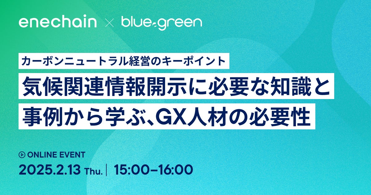 株式会社エスプールブルードットグリーン(本社:東京都千代田区、取締役社長:八林 公平)は、株式会社enechain(本社︓東京都港区、代表取締役社長:野澤 遼/以下、「enechain」)と共同で、2025年2月13日(木)15:00から、「カーボンニュートラル経営のキーポイント 気候関連情報開示に必要な知識と事例から学ぶ、GX人材の必要性」 ウェビナーを開催します。