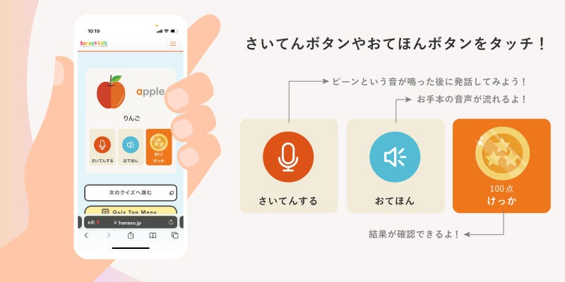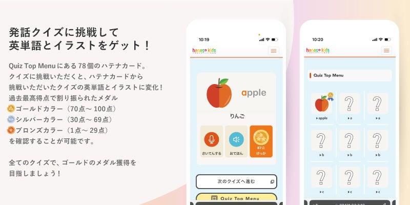 株式会社アンフープ(所在地:静岡県富士市、代表取締役社長:重森 渉)がサイト運営する、無料通話ソフトSkype(スカイプ)またはZoom(ズーム)を利用した子ども向けオンライン英会話「hanaso kids」は、2022年9月1日(木)より、オリジナル英語学習アプリ「ABC touch」シリーズ第5弾 “発話クイズで覚える“「ABC touch Quiz」をリリースいたします。