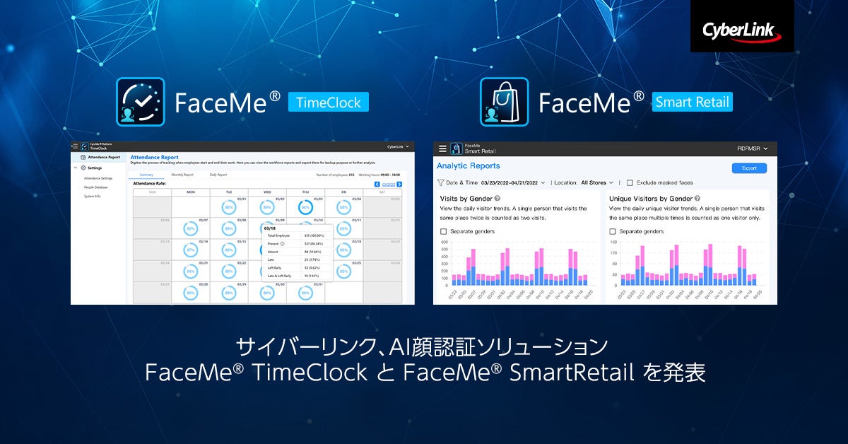 台湾 台北(2022年6月9日)CyberLink Corp.(5203.TW)(本社:台湾新北市、以下 サイバーリンク)AI と顔認証技術のパイオニアであるサイバーリンクは、最新の顔認証ソリューションとして「FaceMe® TimeClock」と「FaceMe® Smart Retail」を発表しました。FaceMe® TimeClockは、従業員の出退勤を正確かつ自動的に記録することで、タイムカードの打刻のために発生していたボトルネックの解消や、タイムカードの紛失やすり替え、不正な打刻などのリスクの排除が可能となります。FaceMe® Smart Retailは、個人のプライバシーを保護しながら、店舗訪問者の統計収集と分析を自動化することができます。FaceMe® PlatformのAPIをもとにした、かんたんに導入できる、使いやすいクラウドベースのソリューションによって、世界で最も先進的な顔認証テクノロジーを日常業務で手軽に利用することができます。