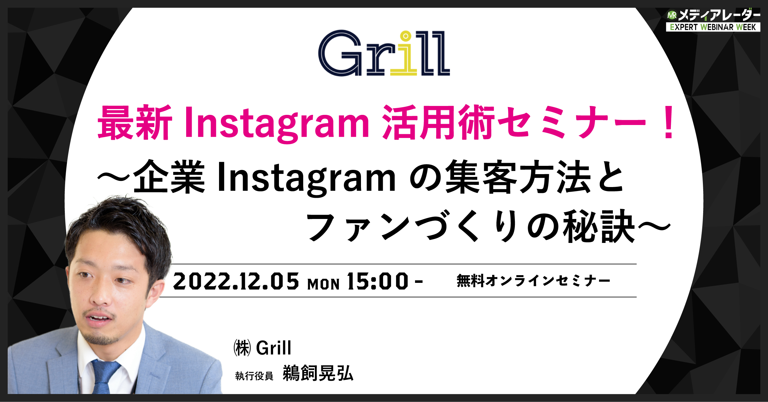 株式会社アイズ(所在地:東京都渋谷区、代表取締役社長:福島範幸)が運営するNo.1*の媒体資料ポータルサイト「メディアレーダー」は、12/5(月)にマーケティングセミナーイベント、第8回 メディアレーダー EXPERT WEBINAR WEEK 2022冬にて、「最新Instagram活用術セミナー!〜企業Instagramの集客方法とファンづくりの秘訣〜」を開催します。参加申し込みは無料です。