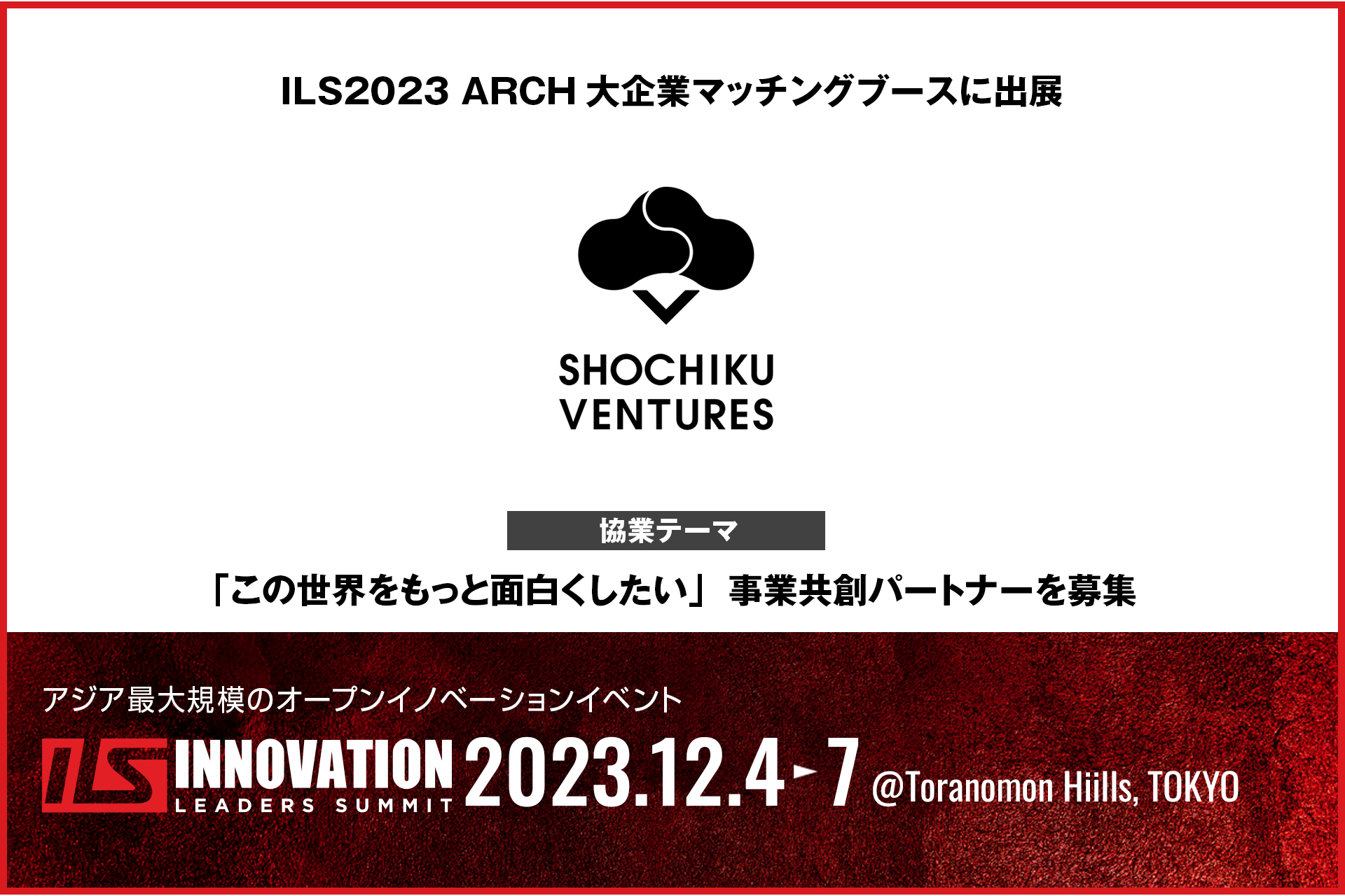 2023年12月4日(月)-7日(木)に虎ノ門ヒルズで開催されるアジア最大級のオープンイノベーションイベント「ILS2023」に、松竹ベンチャーズが協業マッチングブースを出展します。