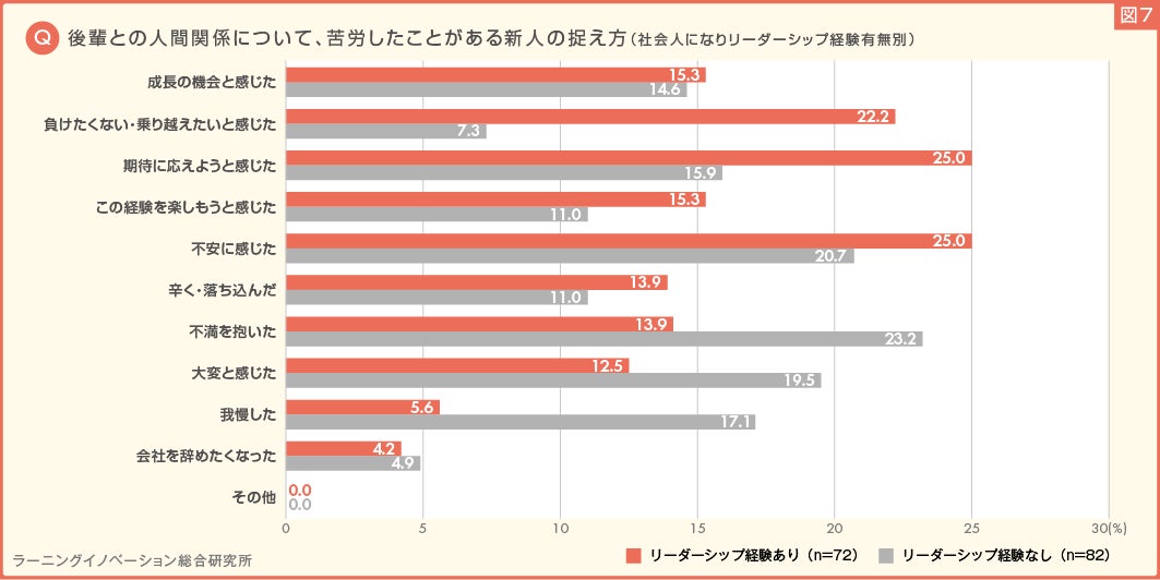 リーダーシップ発揮経験あり社員は「期待に応えようと感じた」「不安に感じた」が25.0%と同率で最大となり、「負けたくない・乗り越えたいと感じた」が22.2%と続きました。一方、リーダーシップ発揮経験なし社員は、「不満を抱いた」が23.2%で最大となり、次いで「不安に感じた(20.7%)」「大変と感じた(19.5%)」「我慢した(17.1%)」となりました。(図7)