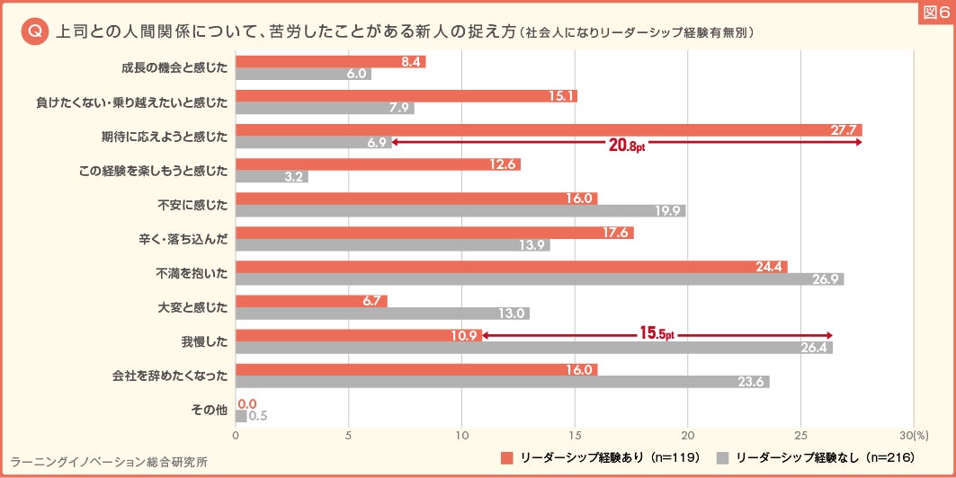 次に、『上司との人間関係』についての壁の捉え方について質問したところ、リーダーシップ発揮経験あり社員は「期待に応えようと感じた」と回答する割合が27.7%と、リーダーシップ発揮経験なし社員と比べて20.8ポイント高い結果となりました。一方、リーダーシップ発揮経験なし社員は「不満を抱いた(26.9%)」「我慢した(26.4%)」「会社を辞めたくなった(23.6%)」が上位を占めました。特に、「我慢した」は、リーダーシップ発揮経験なし社員があり社員よりも15.5ポイント高くなりました。(図6)