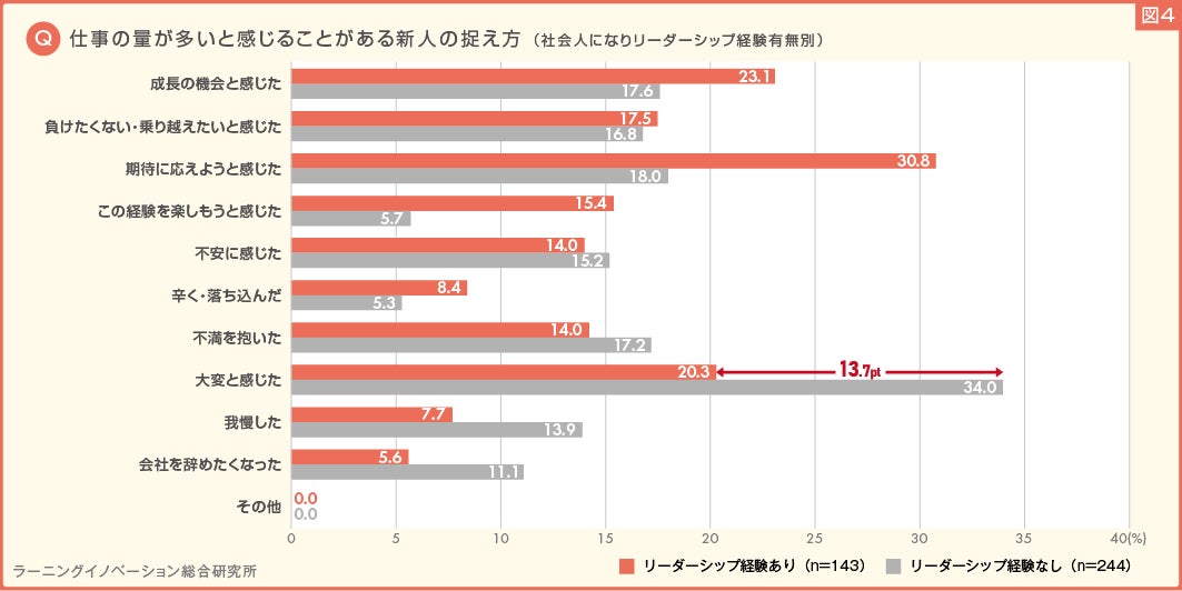 仕事の量の壁、リーダーシップ発揮経験が「ある」若手社員は『期待に応えよう』と感じ、「ない」若手社員は『大変』と感じる