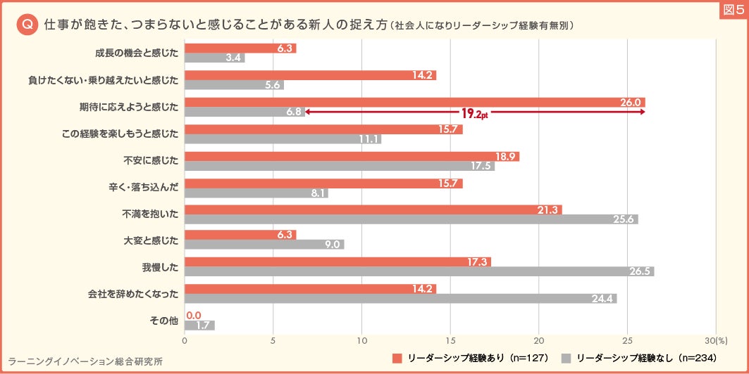 また、『仕事の飽き』の壁でもリーダーシップ発揮経験のあり、なしによって壁の捉え方に違いが見られました。リーダーシップ発揮経験あり社員は「期待に応えようと感じた」が26.0%と最も高くなり、リーダーシップ発揮経験なし社員に比べ、19.2ポイント高い結果になりました。一方、リーダーシップ発揮経験なし社員は「我慢した(26.5%)」「不満を抱いた(25.6%)」「会社を辞めたくなった(24.4%)」とネガティブな項目が上位を占める結果となりました。(図5)