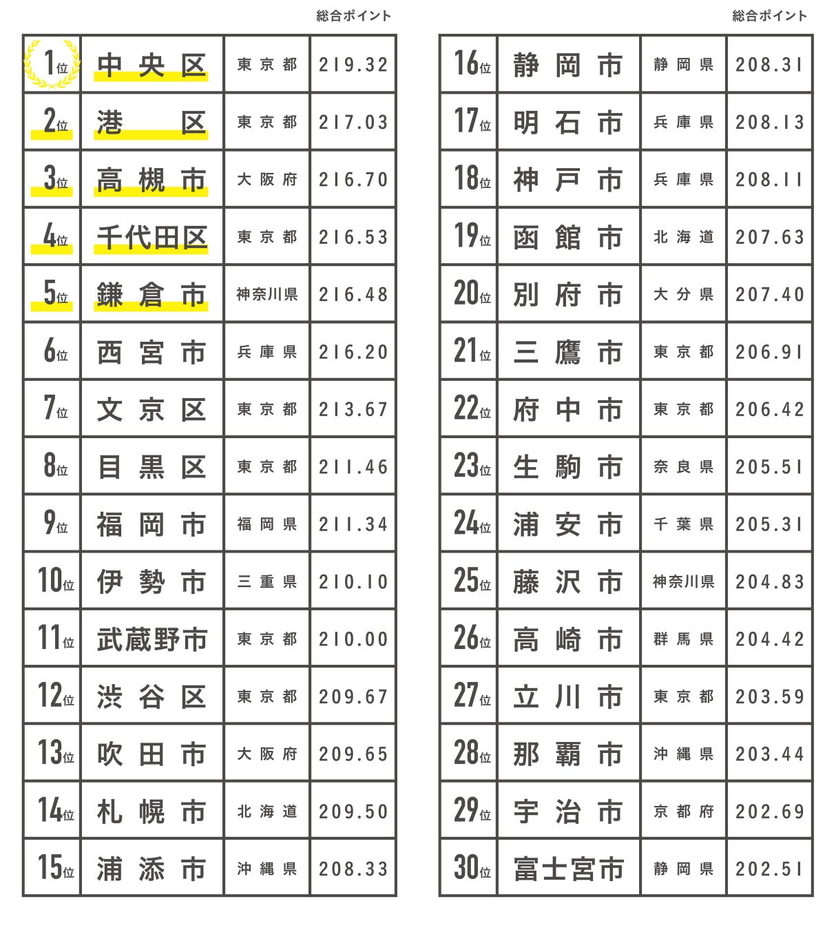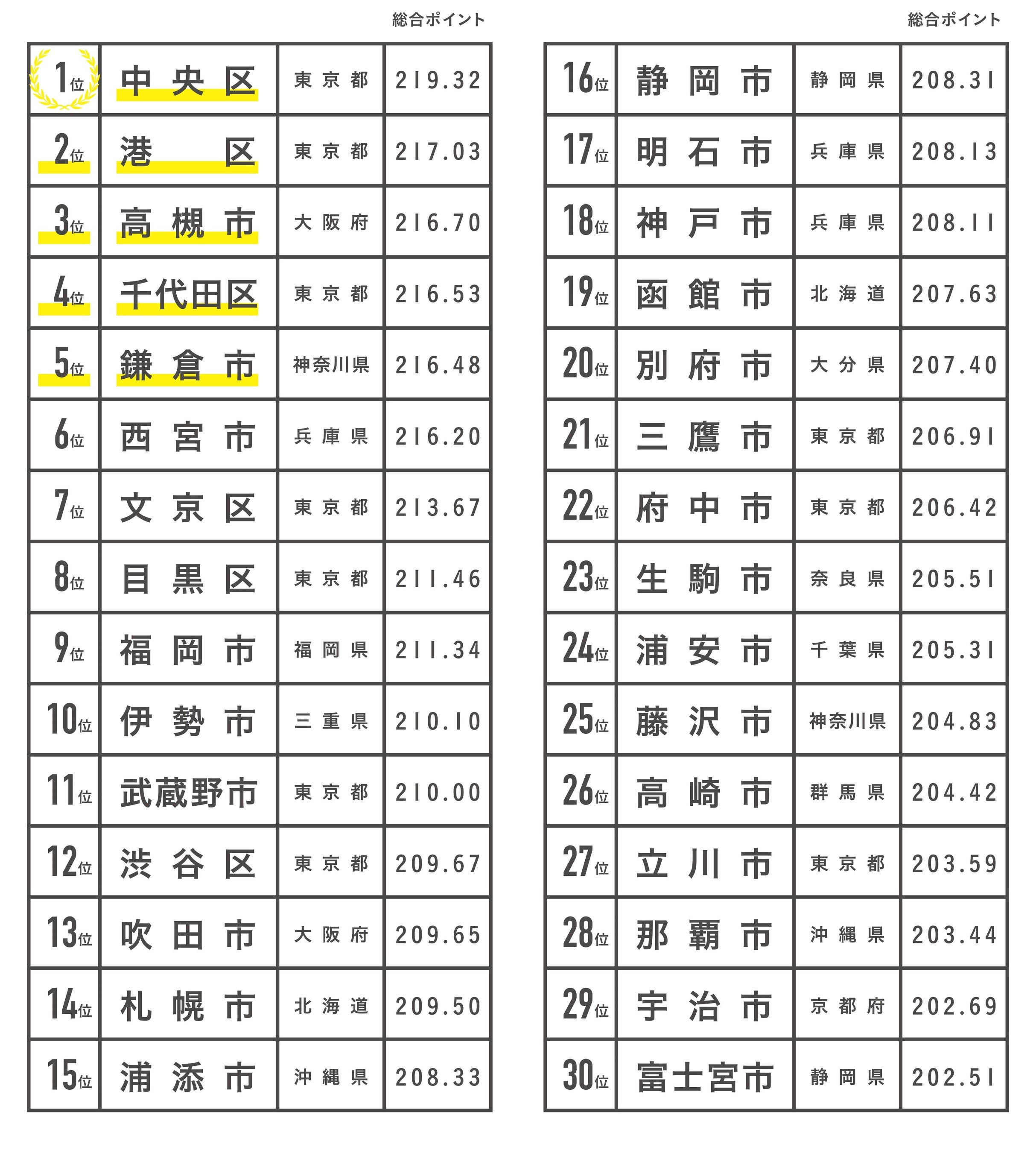 2021年にトップ(※4)だった中央区が、初の全国調査でNo.1に返り咲き