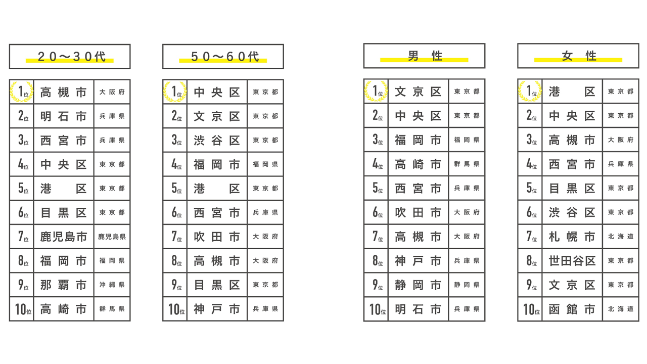 総合では7位だった文京区が男性でTOPに。女性1位は総合2位だった港区でした。文京区では、地域との関わりや伝統・歴史・文化の豊かさが高く評価され、港区は新しい変化や刺激・情報に触れることができるという点で平均を大きく上回る評価を得ました。また男性では、総合26位だった高崎市(群馬県)が4位に順位を大きく上げるとともに、TOP10のうち5つが関西圏の都市だったのに比べ、女性ではTOP10に関西圏の都市は2つのみ、札幌市や函館市など北海道エリアの都市が入るなど、男女でランキングの顔ぶれが異なる結果に。